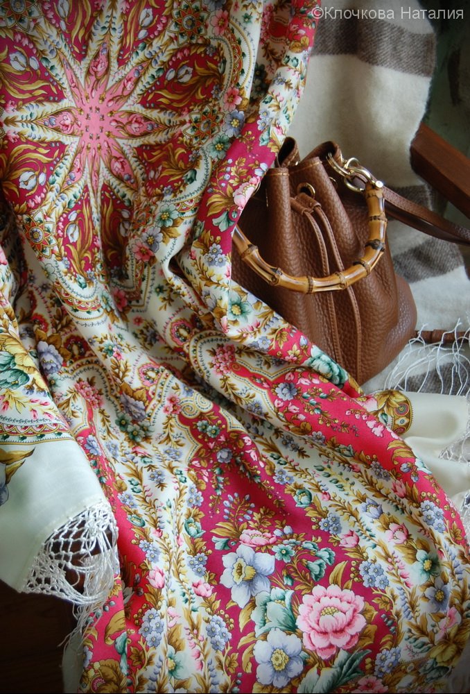 Думаю, что этот Павловопосадский можно будет носить, скрутив поплотнее, не на голове. Реально, платок неоднозначный. Зато вкус мужа понятен)