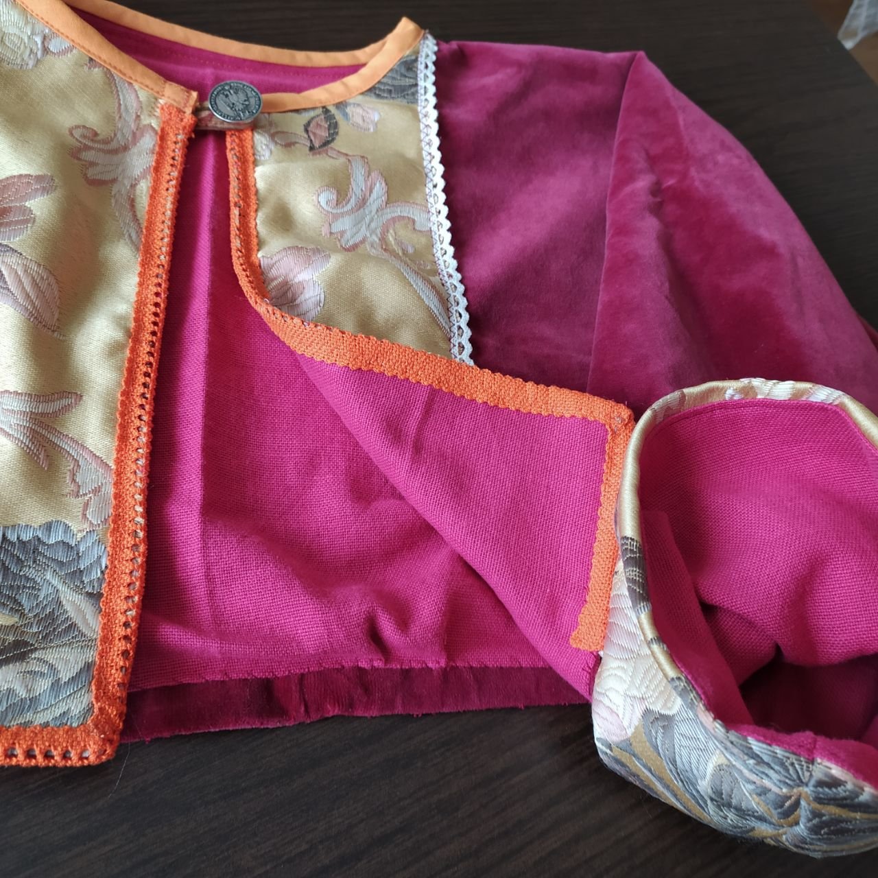Ткань на них могла идти самая разная, от бархата до домашней пестряди. Я пошла по пути аутентичному. То есть - шила из того,что было. А был совсем случайно купленный в антикварной лавке в Швеции кусок старинного бархата. Зачем я его купила - понятия не имею. Наверное, была какая-то идея. Но уже забылась. А ткань осталась. Как раз узкая и почти необходимой длины. Нехватку пришлось дополнить , а заодно и передние полочки отделать тоже остатками "почти парчи". Словом, все как и бывало встарь,- пустила в ход, что смогла найти.