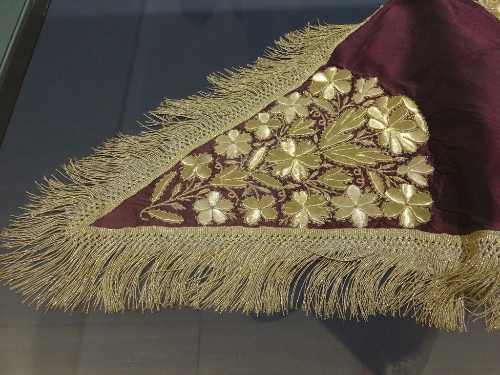 В Нижнем Новгороде открылась выставка "Кустарь-художник". Среди экспонатов всего один "печатный" платок, зато много с золотной вышивкой. Платки с золотной вышивкой были праздничными головными уборами женщин Нижегородской губернии. Вышивка на платках могла располагаться углом, занимая 3/4 платка. Платок с двух сторон обшивали золоченой бахромой. Рисунки на платках были традиционными - они изображали древо жизни, как символ связи поколений, триединства 3-х миров (навь, явь и правь), как центр вселенной, птички символизировали любовь, ягоды винограда- изобилие, благословение божие. Всевозможные цветы и плоды, банты и вазоны, "разметные травы" вышивали мастерицы на своих золотошвейных платках. В среде старообрядцев бытовали моленные шелковые черные платки и косынки, расшитые золотными нитями. Носили такой платок, закладывая его под подбородком за два соседних конца, а сам платок в развернутом виде спускался на спину. Выпускались в Нижегородском крае и так называемые "дородовые платки", в которые облачались самые богатые девушки и молодые женщины округи. Стоил такой платок от 25 рублей и выше. Купцы не скупились на наряды своим дочерям. Ведь от этого зависело будущее любимой дочки. Даже пословица существовала - «Чем наряднее девка, тем богаче жених».