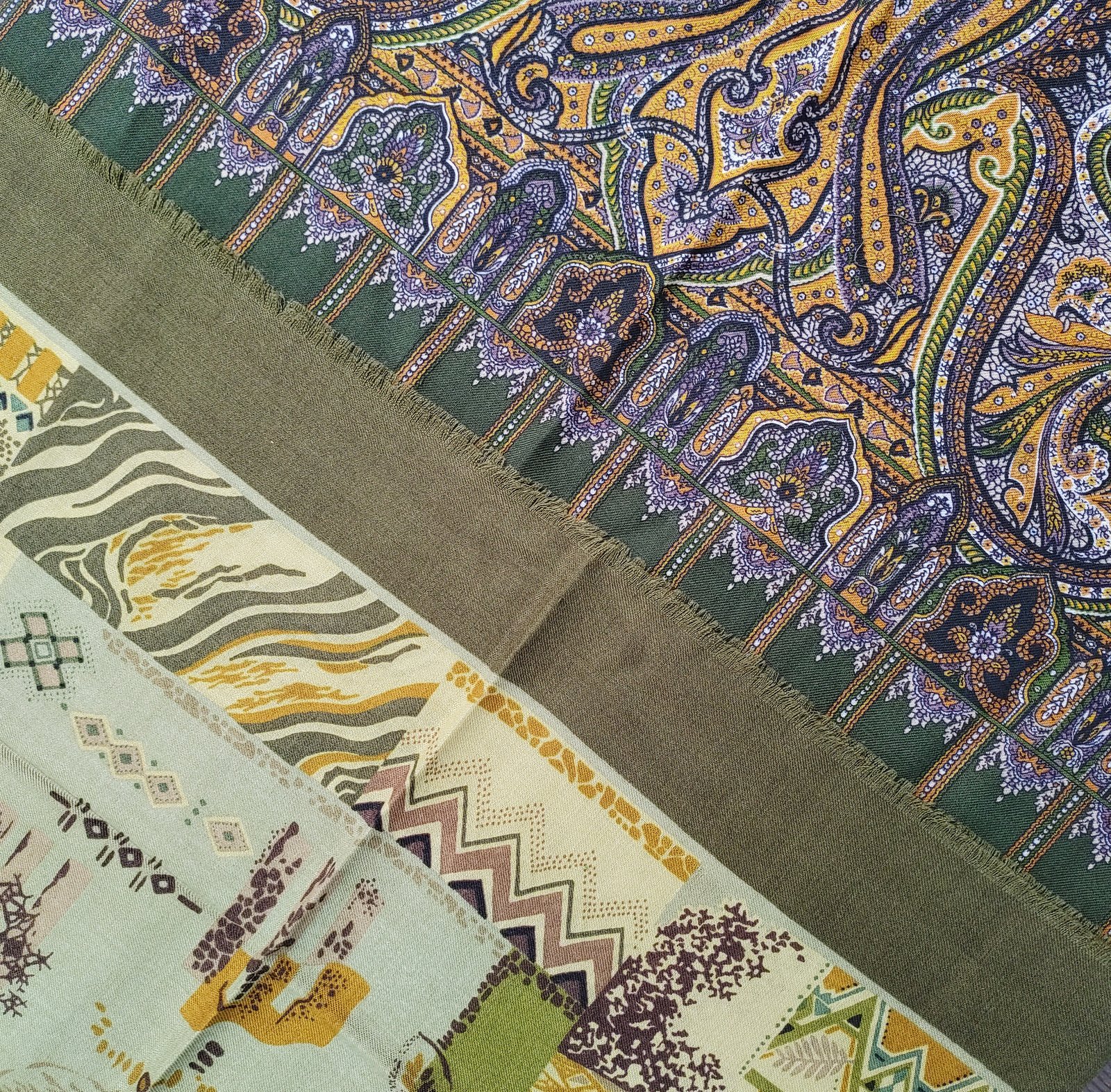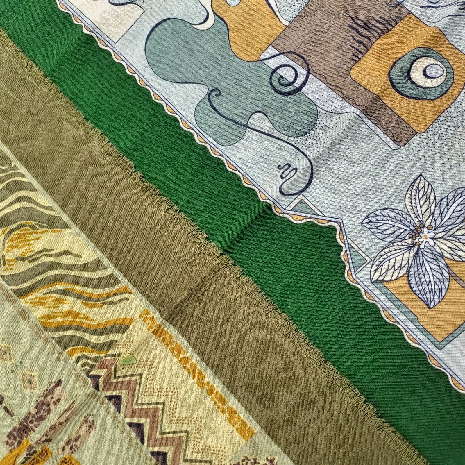 Получила наконец-то свою Иллюзию, сравнила со своими камуфляжными. Для меня она прям зелёная! Очень интересный платочек, по размеру - на плечо просто накинуть или как галстук пионерский повязвть и узел на плечо сдвинуть. И да, надо стирать пробовать, может помягчеет. На фото Иллюзия 10, Свет в окошке 10 и Запах мёда и роз 16.