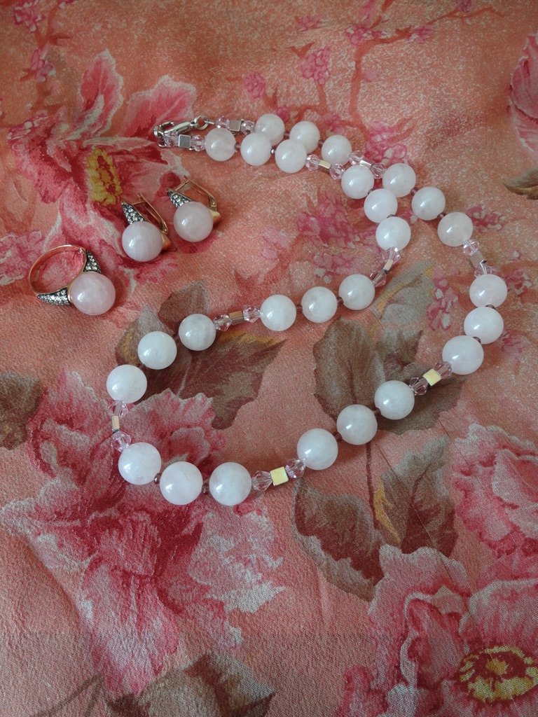 Нежнейшие "Сады Киото" с розовым кварцем. При фотографировании цвет платка исказился. На самом деле он пастельных розовато-бежевых оттенков.