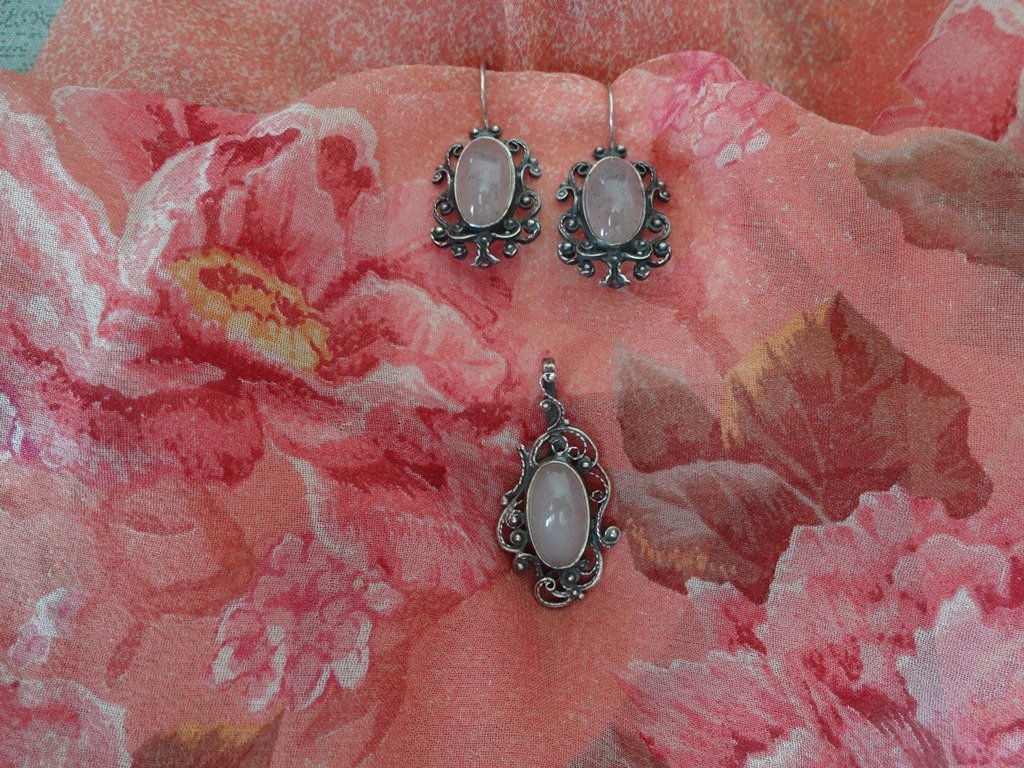 Нежнейшие "Сады Киото" с розовым кварцем. При фотографировании цвет платка исказился. На самом деле он пастельных розовато-бежевых оттенков. Очень люблю халцедон, особенно цвета бледной чайной розы.