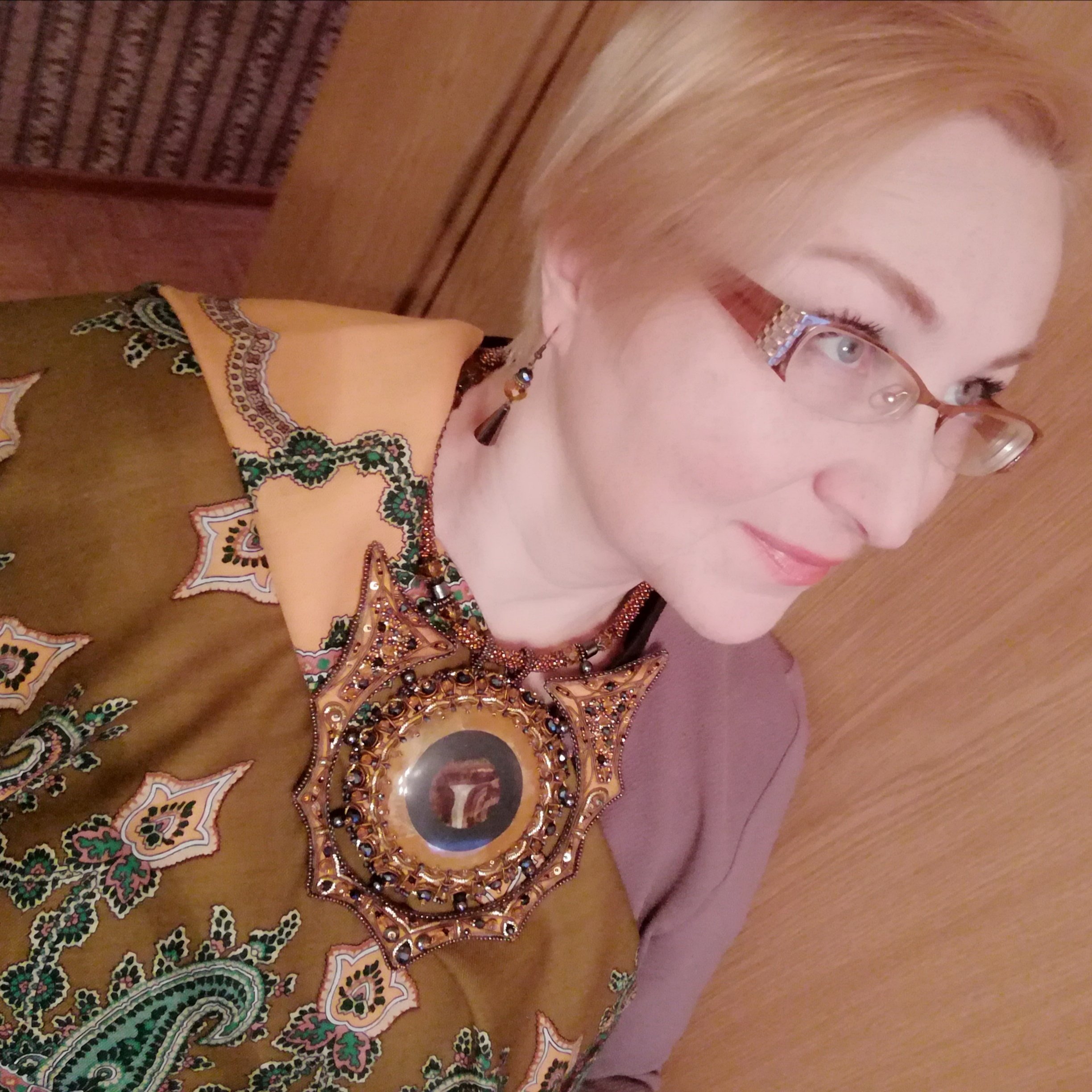 . Сложный колорит, не всем идет, а на вас гармонично смотрится. Украшения очень понравились. Бусы из перламутра?