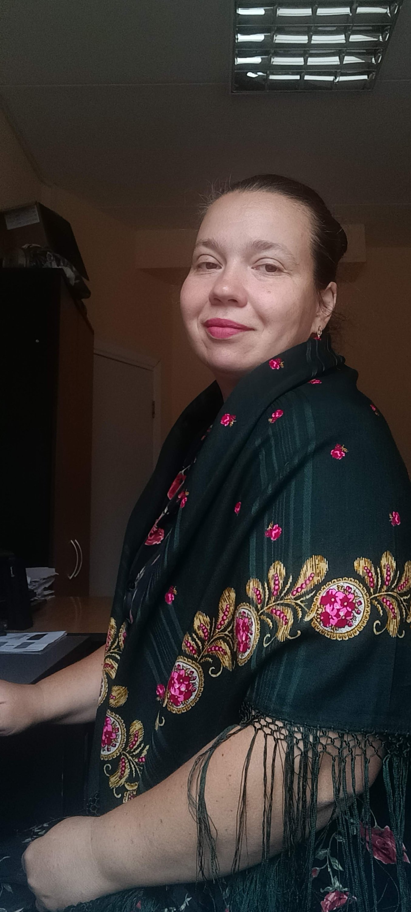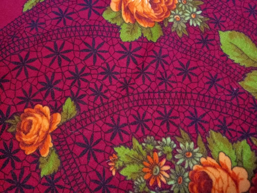 Фон бордовый. Не очень тёмный, но всё-таки бордовый, не красный. В общем, неплохо на фото получился. Причём по всему платку одного цвета, и под "кружевом", и по кайме. Если кажется чуть разным в сообщении выше, то это обман зрения).