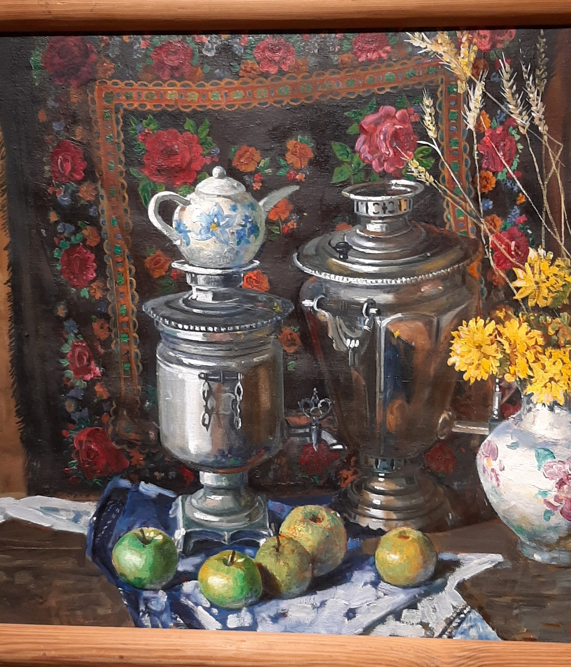Была на выставке Арт Мир.(Кликните, чтобы почитать, что спрятано под катом)... Только на картине Дмитрия Рытяева присутствовала тема платка. А еще в одном павильоне то ли случайно, то ли специально на спинке стула висел павловопосадский платок
