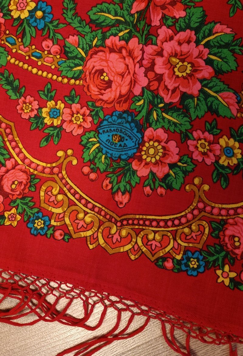 Красный с саржевым переплетением и вязаной бахромой, но значительно тоньше синего, размеры 138х143, ширина каймы от 1,5 до 3,5 см. Хоть они и с саржевым переплетением, но для меня это платки, шали из тех времен гораздо плотнее.