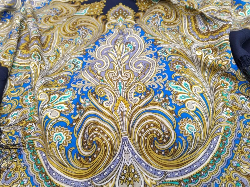 Вот эти зеленовато-желтые линии на мне очень активны Пожалуй, этот васильковый - это единственный синий, который я вижу на платке, но на мне он прятался.
