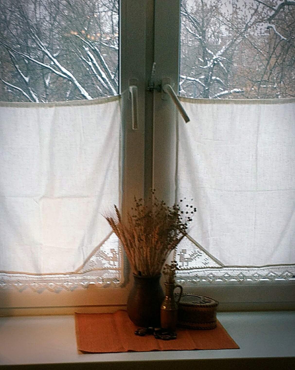 Занавесочки сделаны аж в 90е годы, из простых катушечных ниток, других тогда не было, но хотелось чего то изобразить.