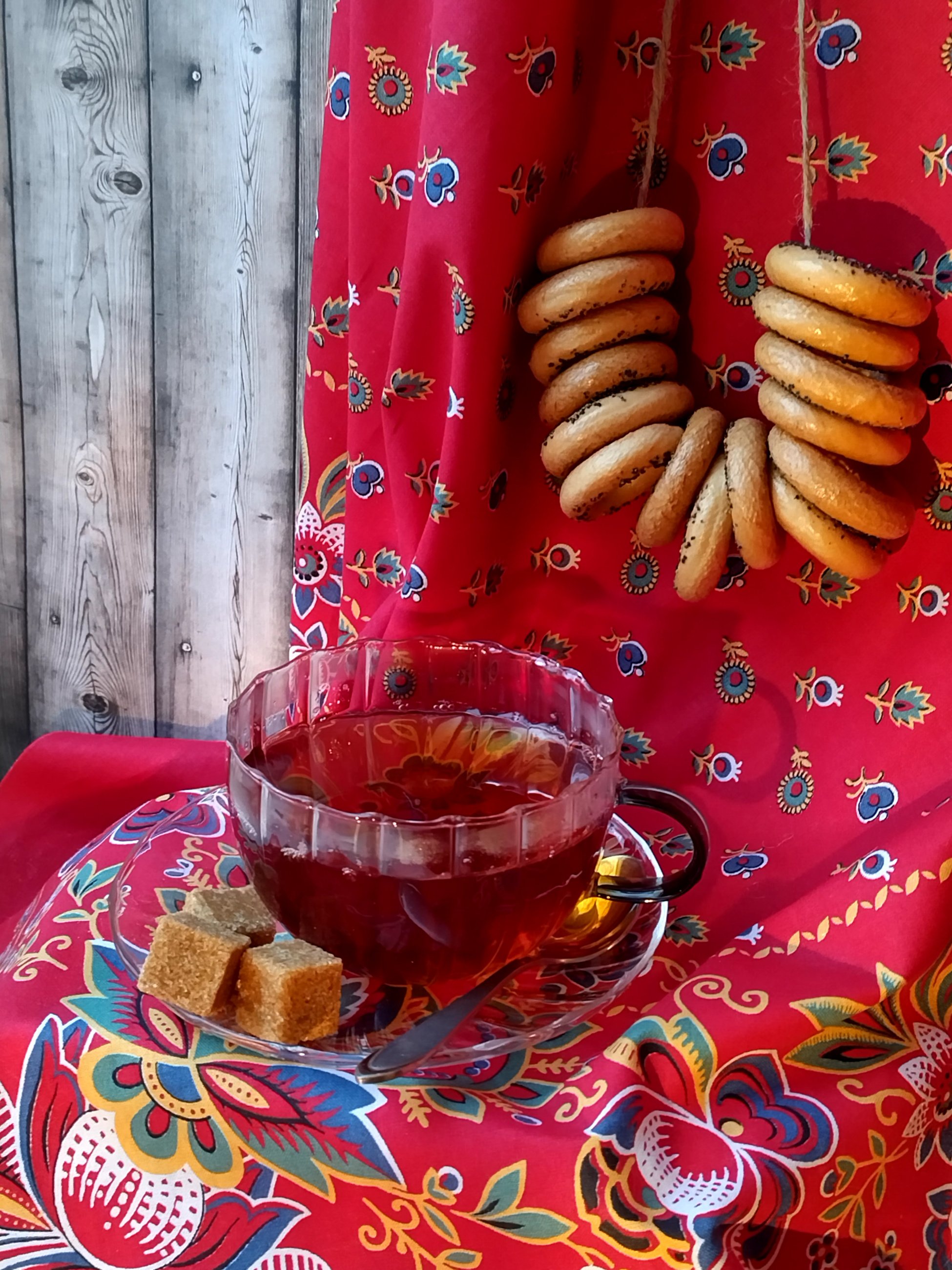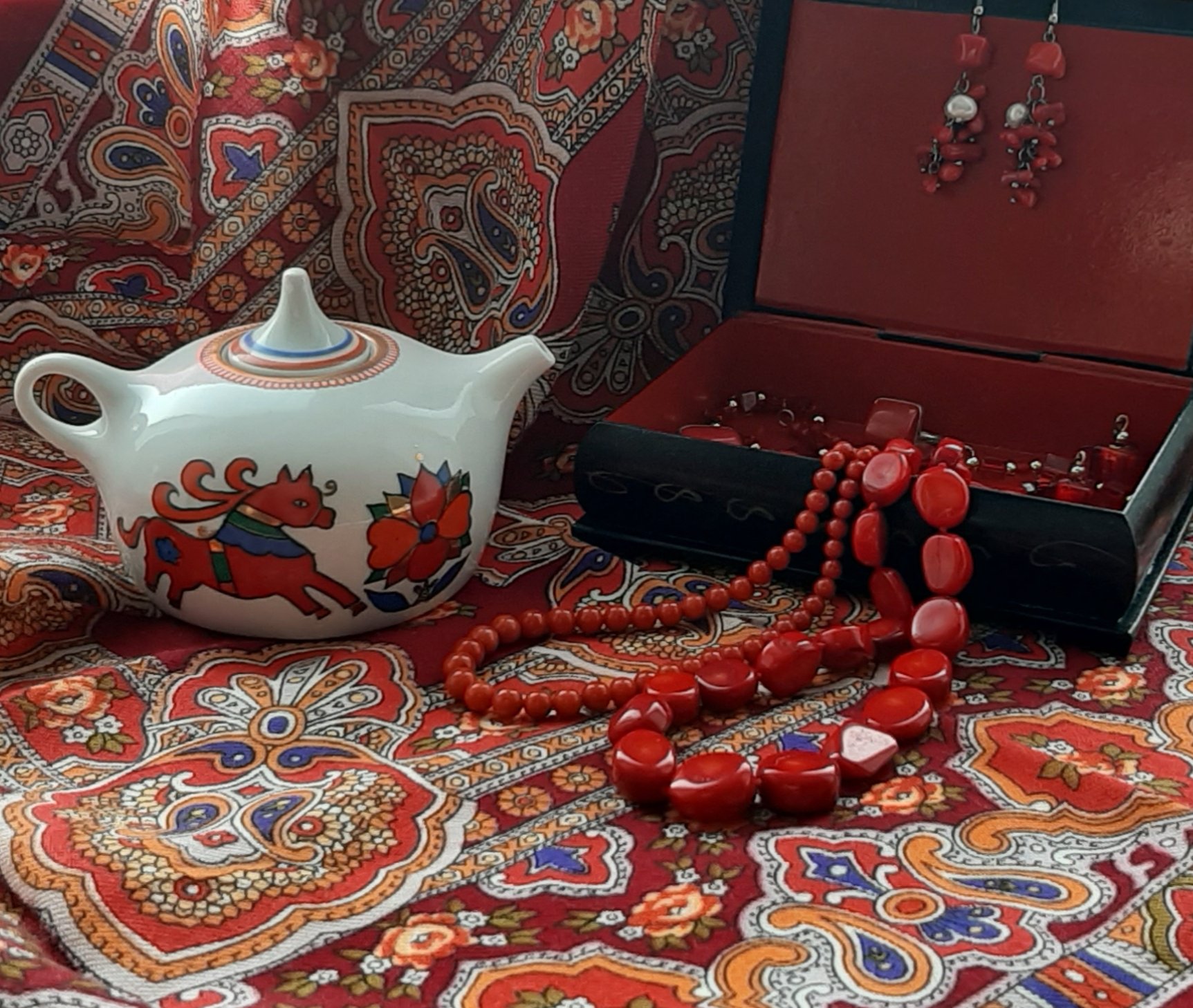Любимый платок "Зоренька" (художник И. Дадонова), тонированные кораллы, муранское стекло и чайничек ЛФЗ (автор росписи А.Воробьевский)