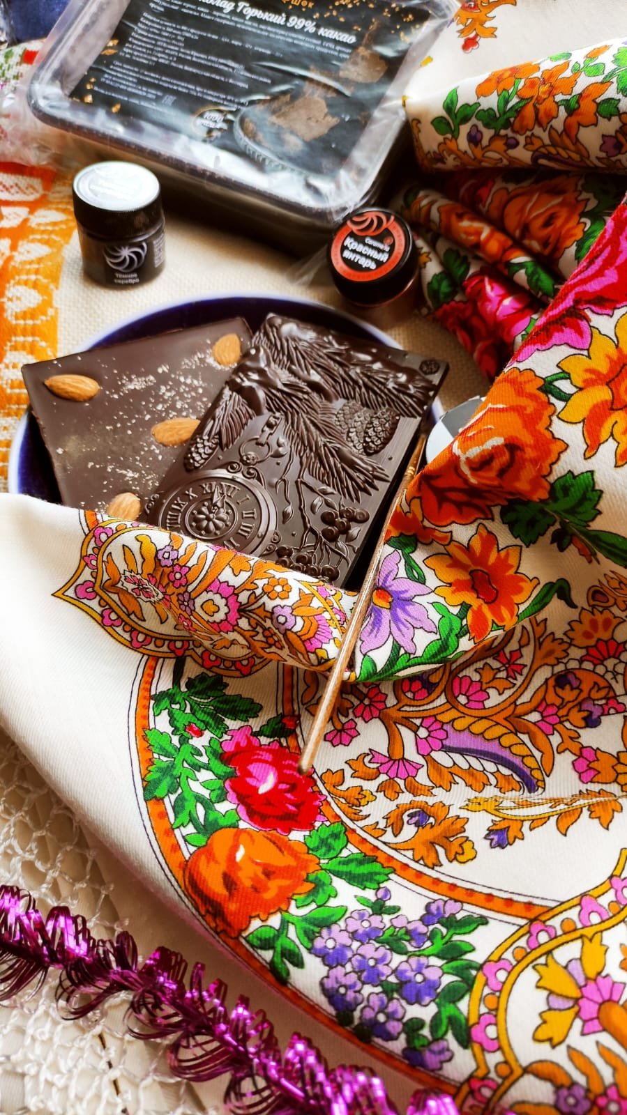 - Из килограммовой развесовки чистого горького (+ванилин) формировала в плиточки с новогодней тематикой, в растопленный добавляя понемножку корицу+гвоздику+мускатный орех+имбирь+кардамон+черный перец + подсластитель эритрит и стевию + совсем мало соли.