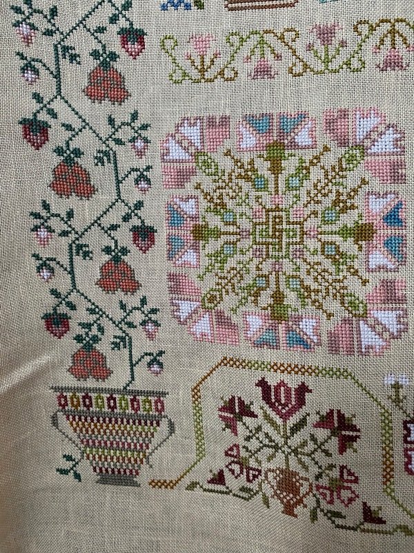 ( Боюсь стирать! Работа в общем то ничем "не замаранная", хоть и вышивалась год-- аккуратно. Освежить, конечно, хочется. Дубовый семплер стирала в ледяной воде с жидким средством--ничего не поплыло)