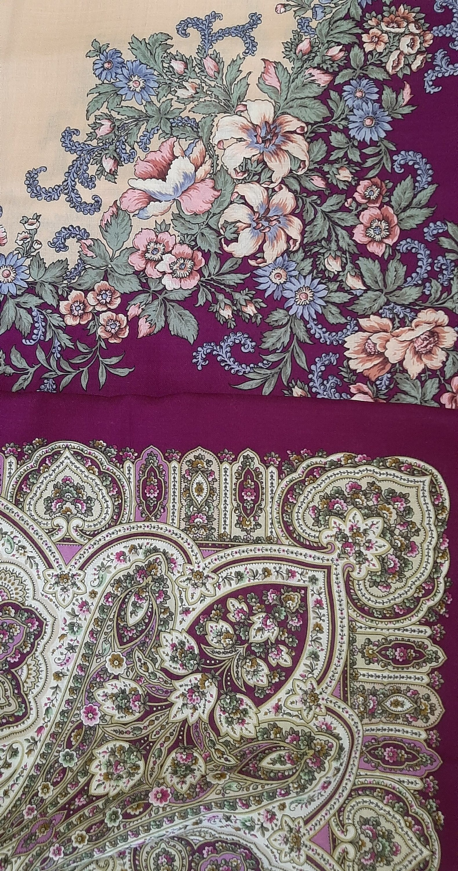 Решила сравнить "Вечерний сад" Т.Сухаревской и "Сны белых цветов" В.Фадеевой. Платки 15-го колорита. В архиве очень мало фотографий этих платков.Снимки сделаны при дневном освещении. При искусственном освещении насыщенный ягодный цвет становится ближе к фиолетовому. "Вечерний сад" очень люблю и так часто носила, что когда платок сняли с производства поспешила купить дубль.На мой взгляд, по цветовому решению у этого платка нет аналогов.