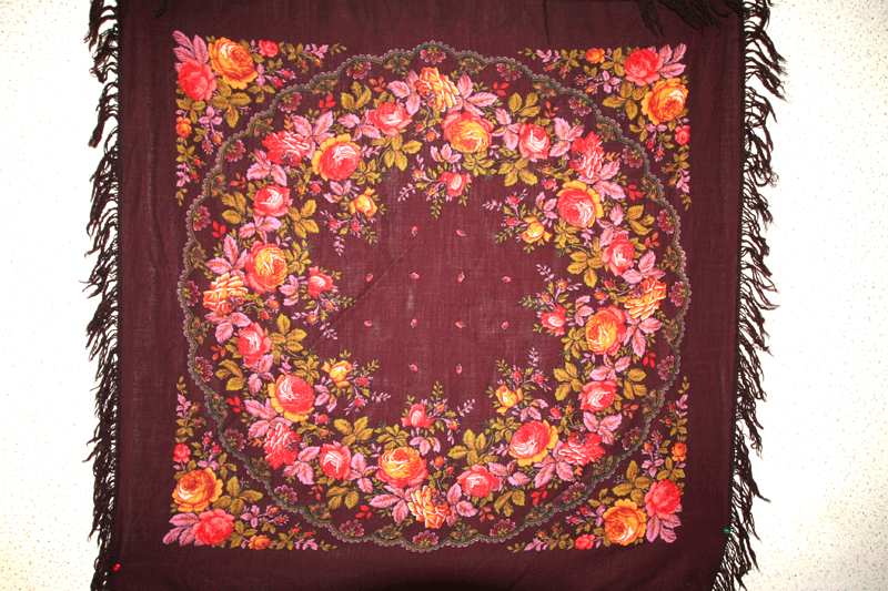 Этот платок очень напомнил мне шаль, которая произвела на меня неизгладимое впечатление году примерно в 1987-1989, когда я была ооооочень далека от павловопосадской продукции.На вечер встреч в школе пришла девочка из параллельного класса, всегда отличавшаяся от других во всех отношениях,одевавшаяся очень необычно и в то же время модно, дорого и элегантно, что тогда нечасто можно было встретить. И была она в черных юбке и водолазке и полушубке натурального меха, и сверху на ней художественно-небрежно был наброшен-намотан большой павловопосадский платок с шерстяной бахромой. Платок был черный, а рисунок был немногоцветный, всего в двух-трех цветах, именно таких, как на вашей фотографии. Меня тогда поразило, необыкновенно понравилось это сочетание розово-фиолетовых и золотисто-желтых роз и глубокого черного фона. Я даже какое-то время заходила в магазины, где продавались павловопосадские платки, надеясь найти такой, но ничего подобного нигде не увидела.