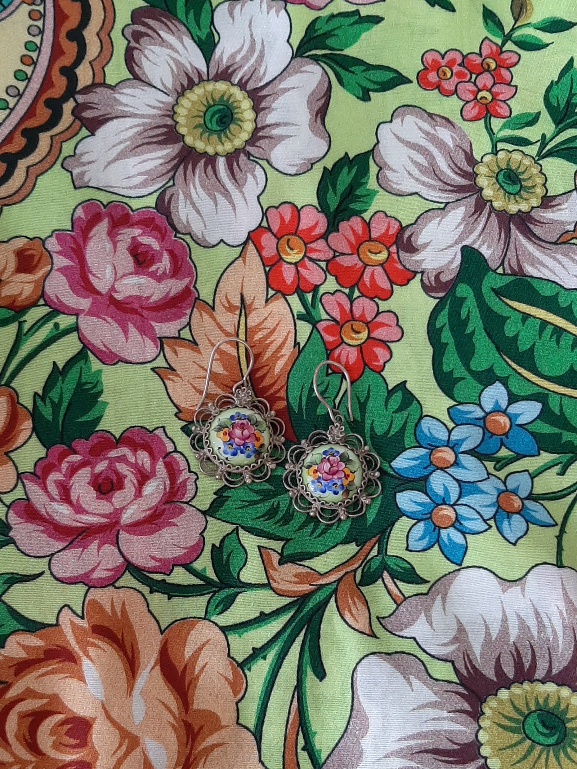 2. Сочетать финифть и платок КАЖЕТСЯ непростым, т.к.это 2 ярких акцента с рисунком, а надо один. Это потом понятно, что всё прекрасно сочетается