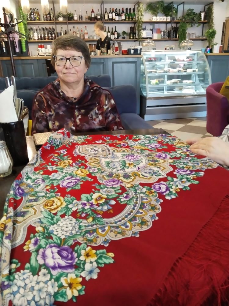 И с этого предисловия продолжу и покажу Таню в красной Княжне. Уткина рисовала. Красивый платок, с колоритами, ну на мой взгляд намудрили, но выбрать можно и Алла выбрала красный! И на Тане С серым хорошо сочетается.