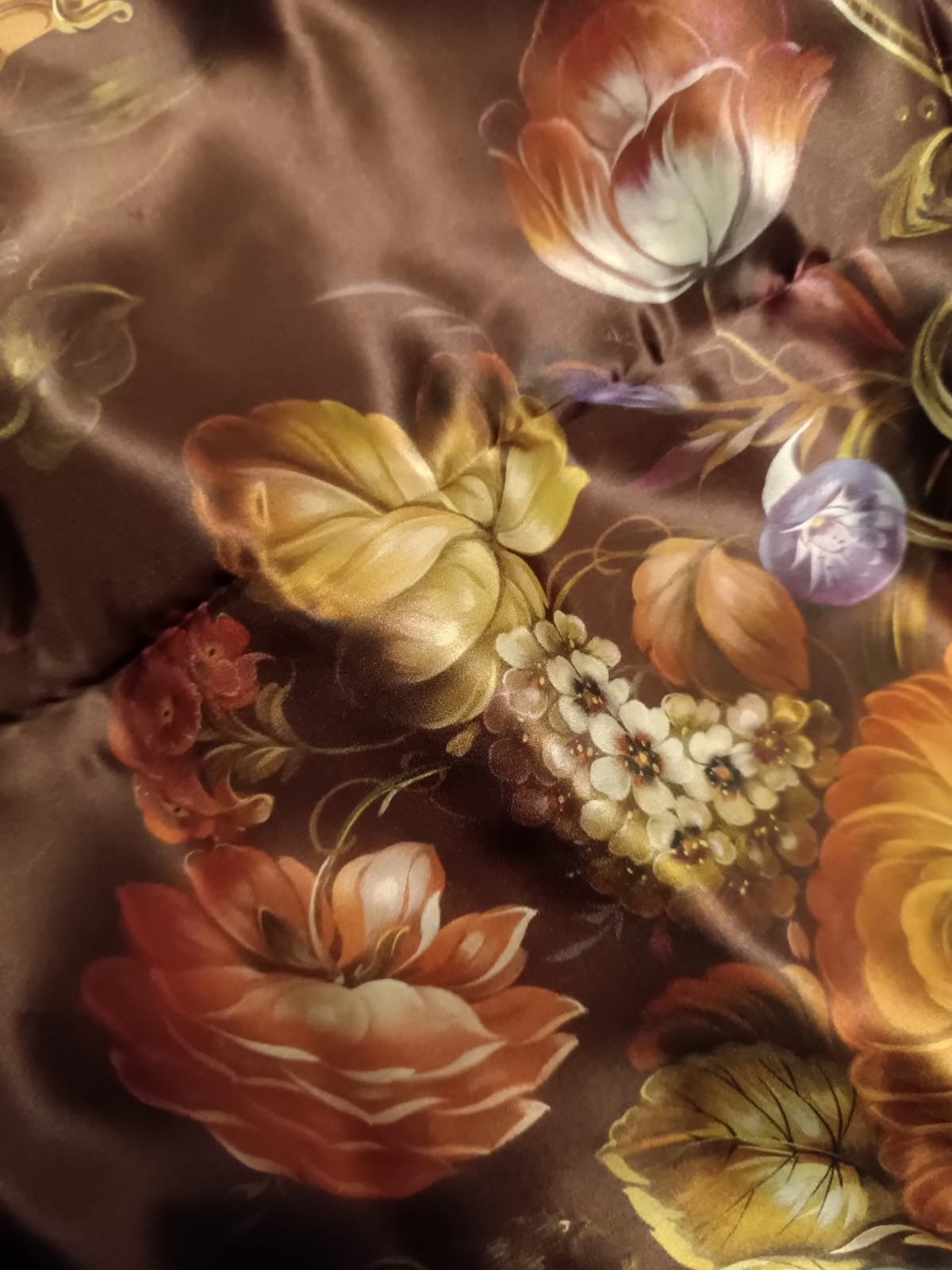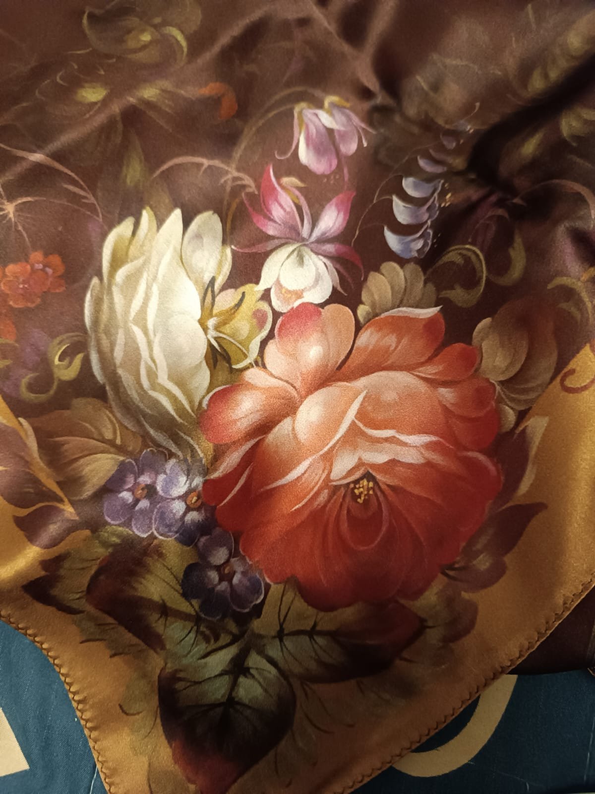 Красота невероятная, теперь надо сделать фото при дневном свете. В углах букеты одинаковые, кайма узкая, рисунок занимает все поле платка
