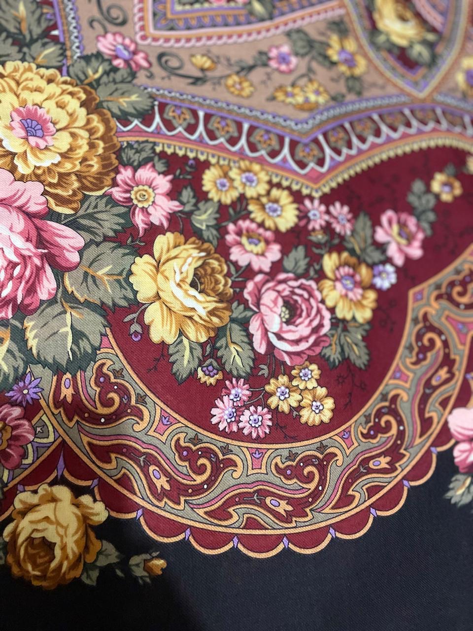 Всем добрый вечер! Смотрю, новые Праздники Покрова никто не показывает. Получила зеленый, показываю. Цвета в основном передались на фото, только стали немного посветлей и поярче. Что могу сказать - был этот платок, продала, о чем потом очень жалела. Помню его зелено-бело-желтым. На новом вместо фарфоровых роз какие-то цементные. Теперь он зелено-серо-желтый. Разочарована. Полезла в архив и поняла, что действительно был такой вариант печати. Очень жаль, что именно его взяли за основу.