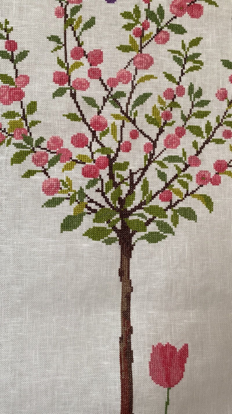 А я закончила, наконец, свое "Персиковое дерево"--Eva Rosenstand ( 08-2864). Только сняла со станка. Набор вышит без изменений. Последние полгода были непростыми, поэтому работа растянулась на месяцы, ввиду нехватки времени. Технически вышивалось быстро--вышивка очень простая. Дизайн милый--отличается насыщенностью, резкими переходами цвета, графичным расположением деталей.