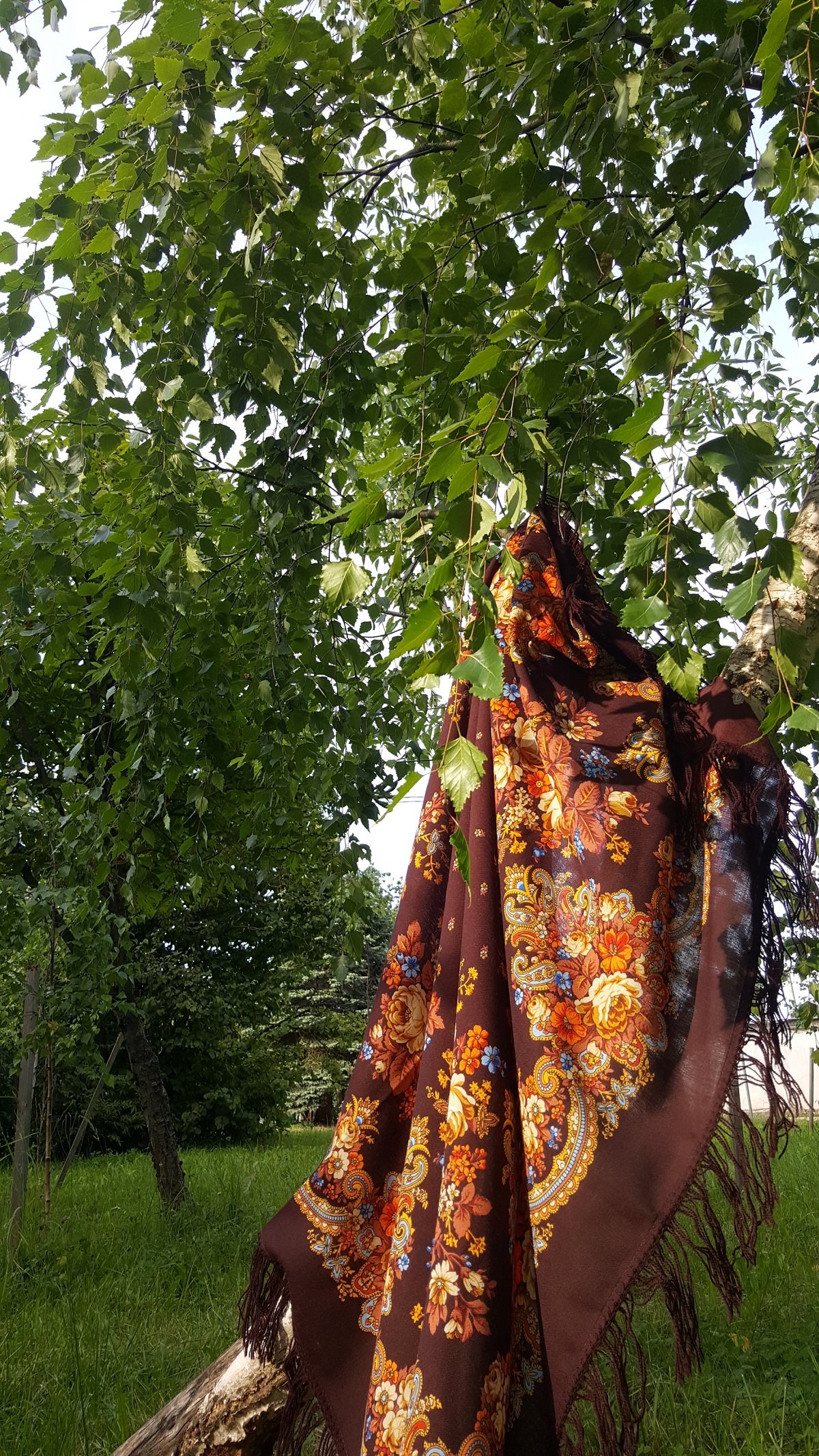 По традиции бежевые и коричневые платки у меня носятся летом. Невероятной красоты жаккард "Безмятежность" 16 колорит художника Татьяны Сухаревской неожиданно замиксовался с купонным рисунком хлопкового платья. На фото диссонанса в этом сочетании не вижу, наверно, возможно и для жизни так использовать. Нравится соединение летящих, слегка размытых цветов платья и более чёткого рисунка платка. В этой теме "Безмятежности" пока не было. Пусть будет!