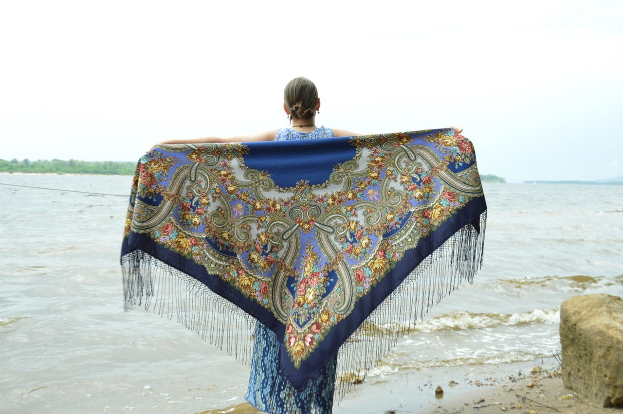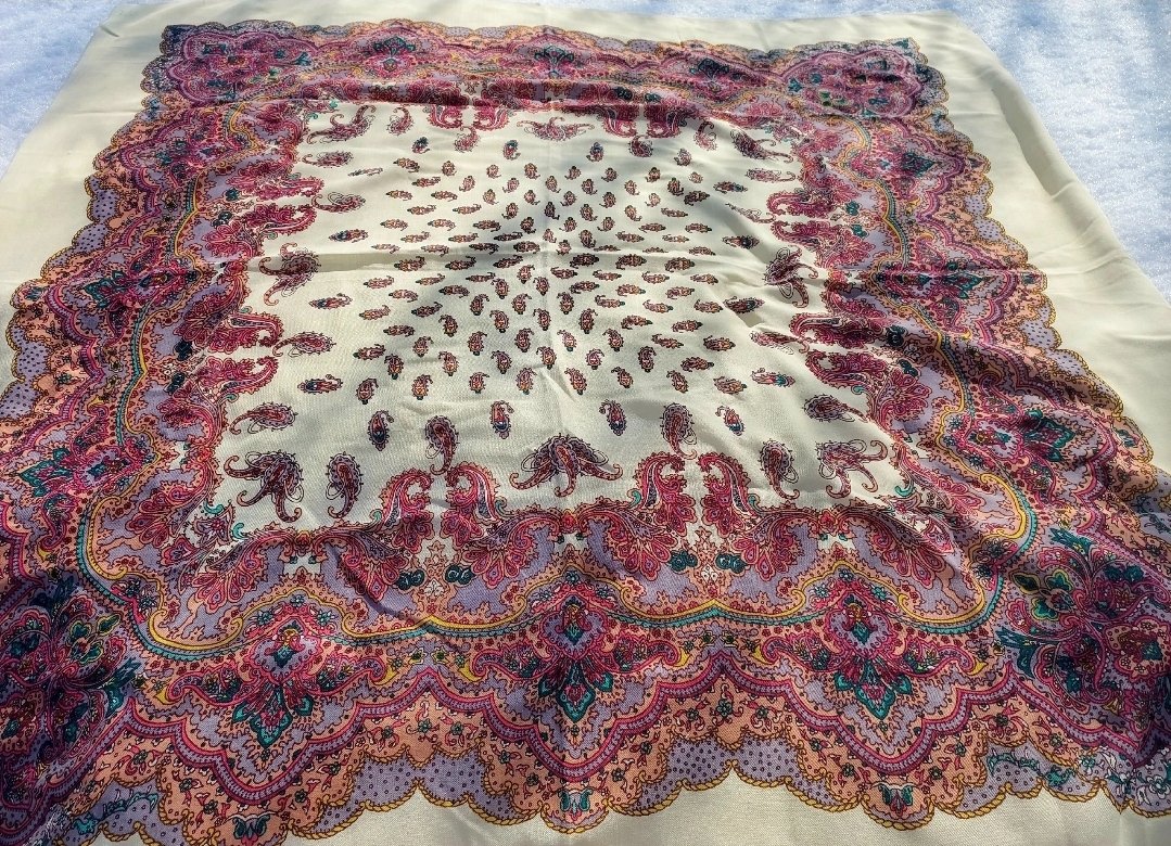 Двойственные чувства вызвал. Сначала произвёл впечатление избыточности элементов... Потом этот минус вдруг превратился в большой плюс. Если сложить по-разному, то платок порой не узнать. Можно его стилизовать в народном, офисном, романтичном, восточном и даже пин--ап стиле. Цвета - роскошные, тут и светлый коралл, лосось, цвета жемчуга, шоколад, серо-голубые, золото.