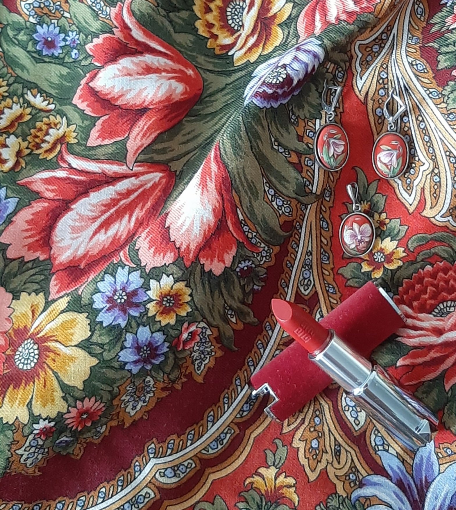 Любимые оттенки красного в платке "Душистый луг" (художник Н. Белокур) , а еще кораллы, финифть, деревянный конь с городецкой росписью и кукла в народном костюме