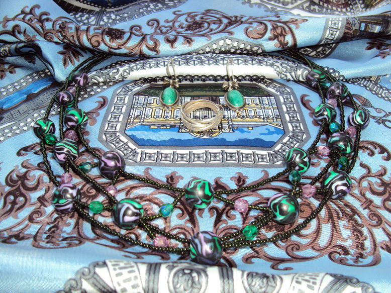 И, как исстари говорится на Руси: «раз пошла такая пьянка, режь последний огурец», - раз начала показывать платочки из серии «Города», то буду последовательна. Покажу сочетания оставшихся двух с произведениями одной замечательной мастерицы-искусницы, сейчас проживающей во Франции. Ксюша работает с полимерной глиной (последняя, если мне не изменяет память, ещё не была представлена на этих страницах, а ведь данный материал предоставляет широчайшие возможности для творческого самовыражения); и так как в плюс с прекрасными человеческими качествами Ксюшенька ещё и моя близкая подруга, то я доподлинно знаю, сколько труда, мыслей, сил, души и времени она вкладывает в авторскую разработку своих эскизов и кропотливую сборку всех вылепленных элементов и узоров задуманного комплекта, чтобы её Бижу было таковым на деле и носилось с удовольствием – что и происходит на практике