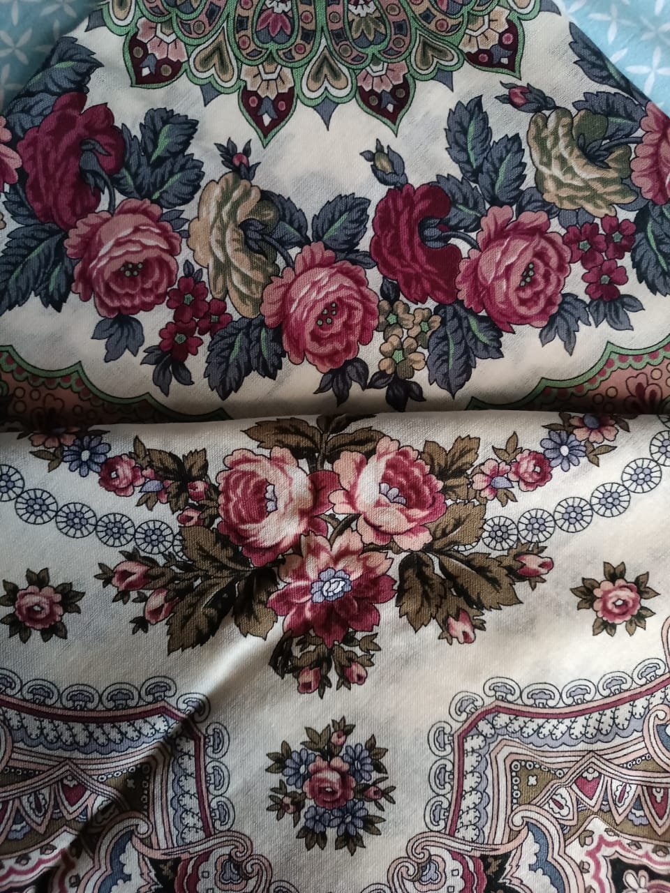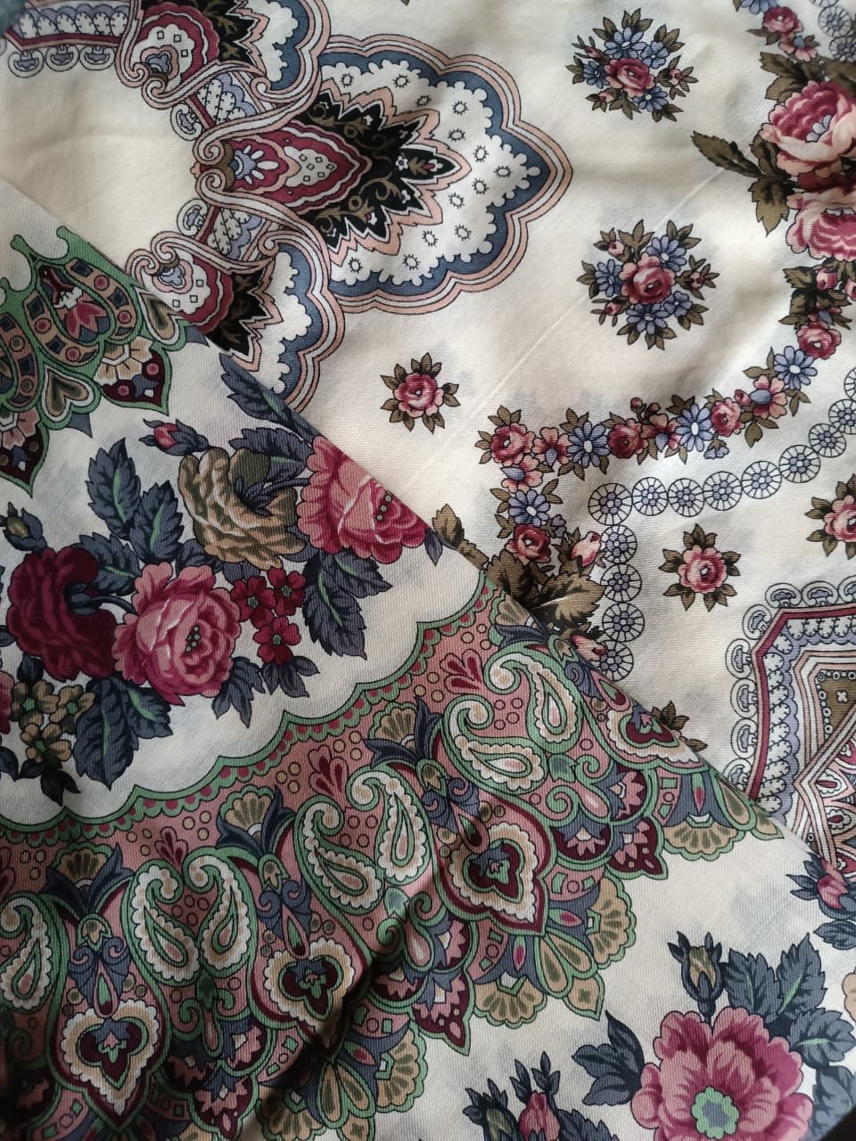 Мне он нравится своей статичностью. И кайма такая, немножко старомодная. :" Красиво ложится, когда на голову повязываешь.