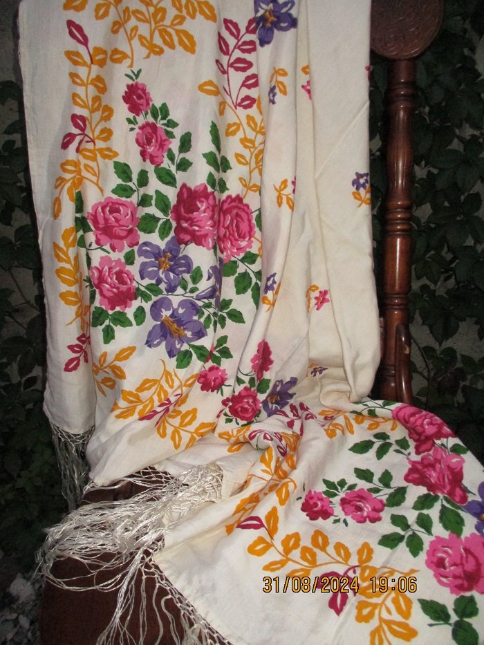 У вас замечательная старинная шаль ручной набойки с цветочным мотивом. Время её создания угадать сложно, но я бы определила между 1910 и 1925 годами прошлого века. Думаю, шали более 100 лет. Если она принадлежала вашей семье, напишите, известна ли вам её история. Если на изнаночной стороне отсутствует фабричное клеймо, то место производства точно определить невозможно. Как-то так. Если вам как-то помогла, буду рада.