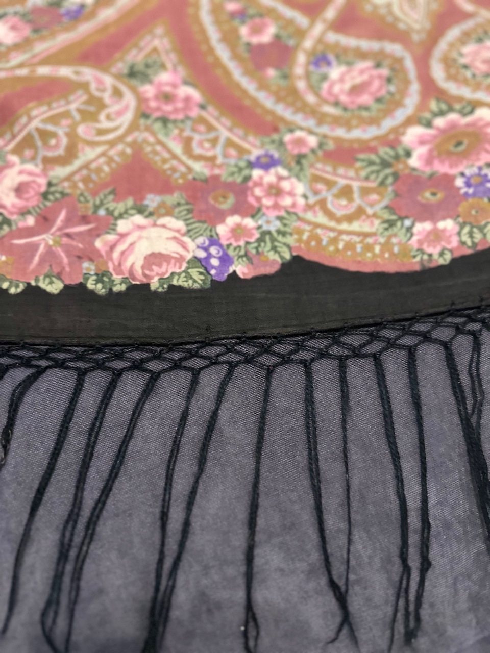 У вас замечательная старинная шаль ручной набойки с цветочным мотивом. Время её создания угадать сложно, но я бы определила между 1910 и 1925 годами прошлого века. Думаю, шали более 100 лет. Если она принадлежала вашей семье, напишите, известна ли вам её история. Если на изнаночной стороне отсутствует фабричное клеймо, то место производства точно определить невозможно. Как-то так. Если вам как-то помогла, буду рада.