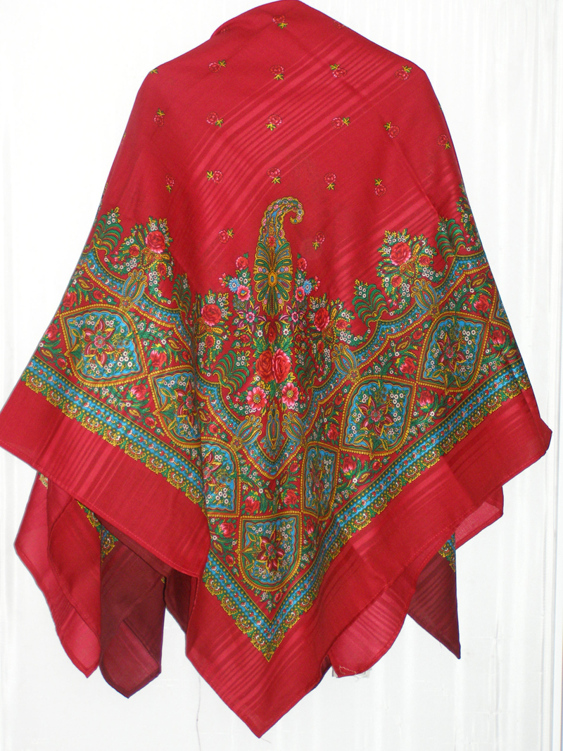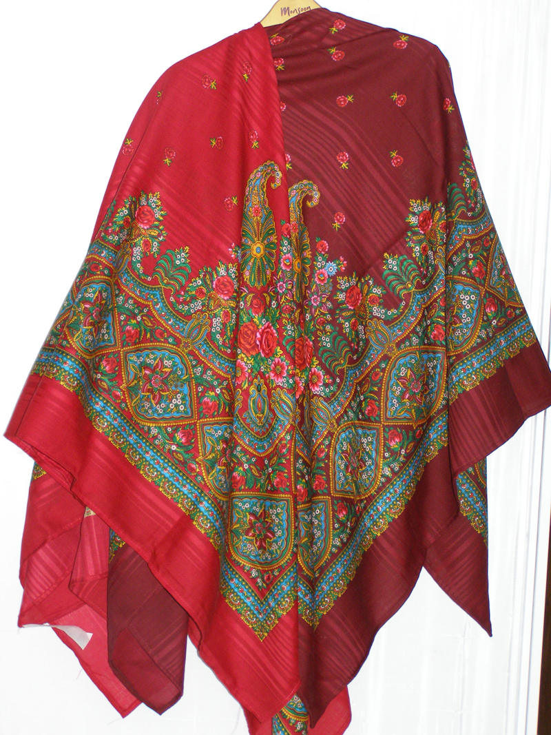 Если соединить две "Долины цветов",как писала Eva по шведскому варианту,то получилось бы прекрасное пончо.Надо,если не ошибаюсь,свернуть платки по диагонали и заколоть на плечах,отмерив равные промежутки.По-моему, в примерочной это было показано на примере "Счастливицы". Было бы оригинально:красный платок спереди,а вишневый сзади,а можно и наоборот. :: Вообще,это идея: из платков с просновками можно много интересного сконструировать по шведскому варианту,о котором писала Eva.