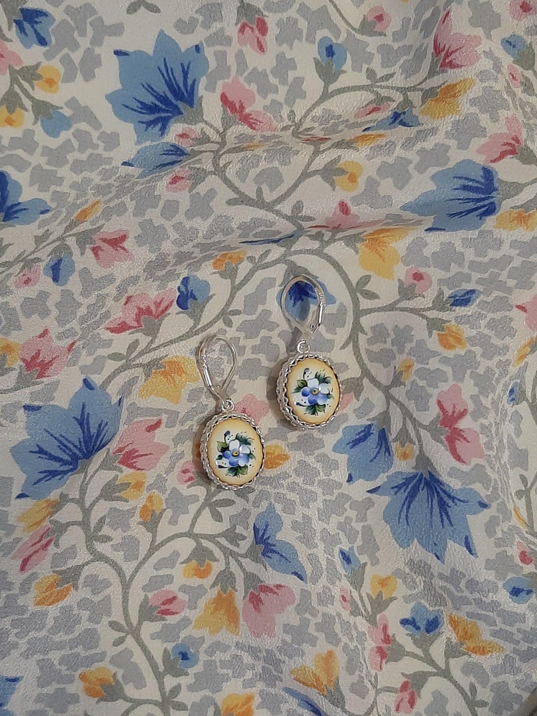 А это мой старенький комплект пермской финифти. Оправа местами покрылась зеленоватой патиной. Не знаю чем почистить. Средство для чистки серебра и сода не помогли.