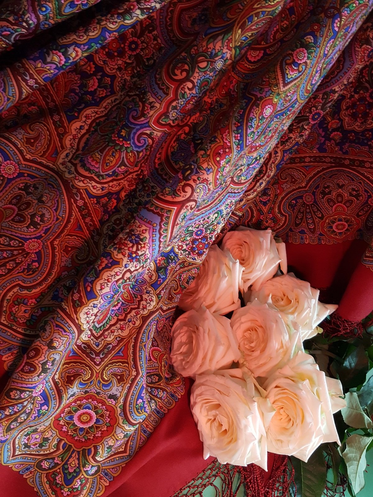 Очень красивая шаль и фото! Где белые розы на фоне шали, можно название платка?