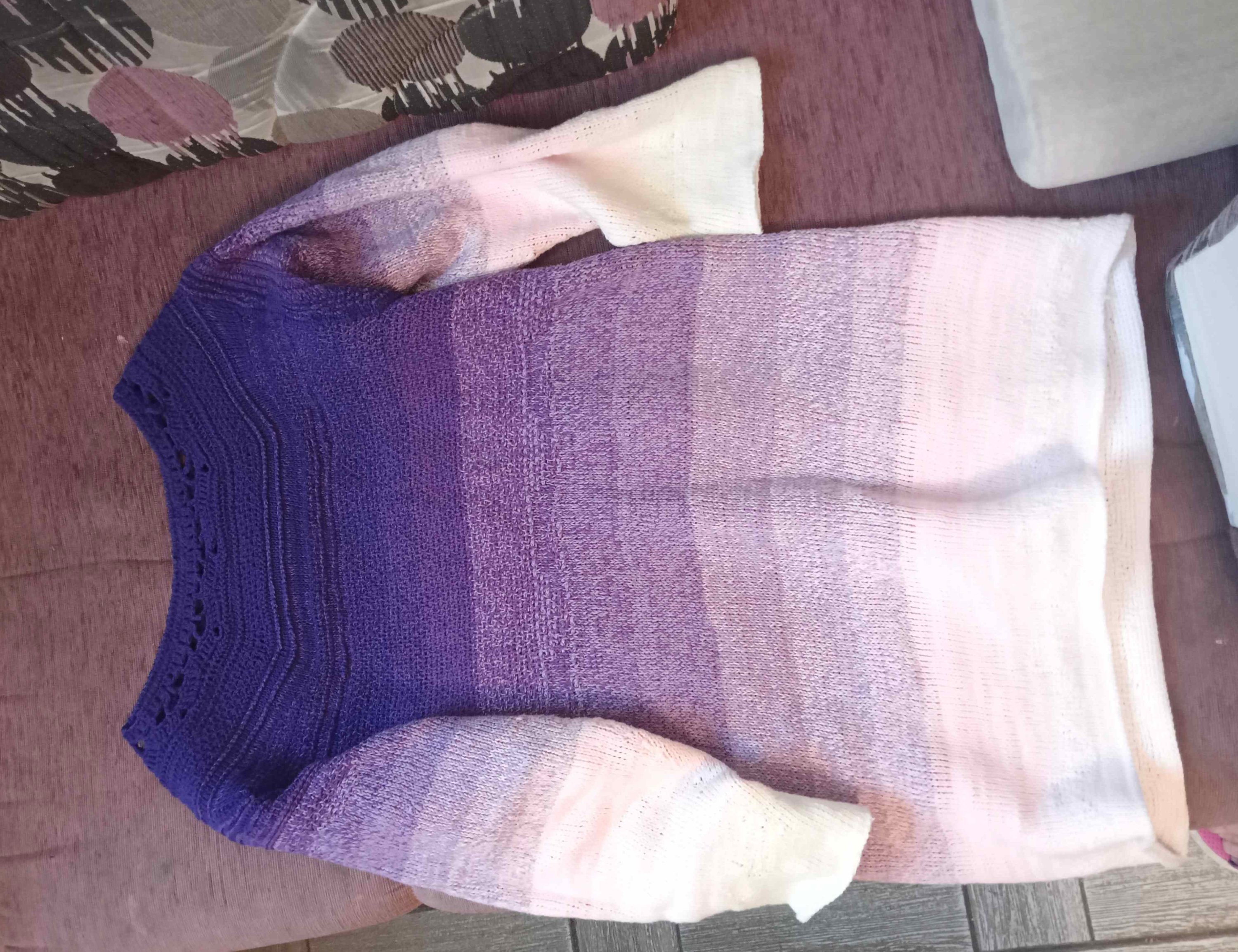 Я, наконец, довязала тунику. Вязала сверху вниз, начала - обычным крючком, дальше - тунисская вязка (по новой книжке, вязание от 2 клубков по кругу). Спицами так плотно, тем более хлопок, не сумела бы. Нитка - меланж, с градуировкой цвета.