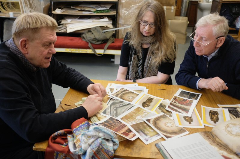 Потом мы пригласили Татьяну Сухаревскую и Вячеслава Долгова в театр на встречу и Татьяна Крупенникова провела для них небольшую экскурсию по зданию театра для ознакомления с интерьерами театра, его зрительным залом и украшающими элементами зала, фойе и лож - материалом, с которым предстояло работать Татьяне Сухаревской.