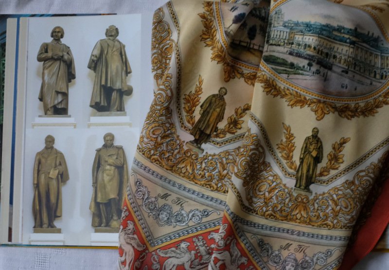 В уголках платка мы видим маленькие изображения памятников Пушкину, Лермонтову, Гоголю, Грибоедову - авторов, чьи пьесы идут в Малом театре. Сами памятники скульптора М.Г. Манизера расположены в нишах на лестницах в зрительском фойе.