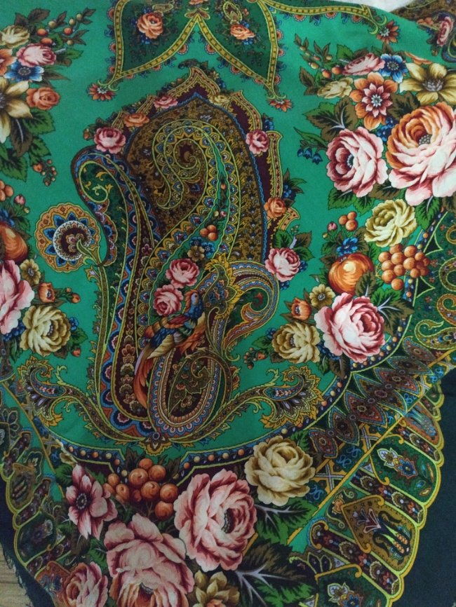 У меня чередование зелёного с красным. Поскольку цветопередача страдает, несу любимые зелёные сюда . Павловопосадский -9. Мы с моей подругой его вдвоем любим!