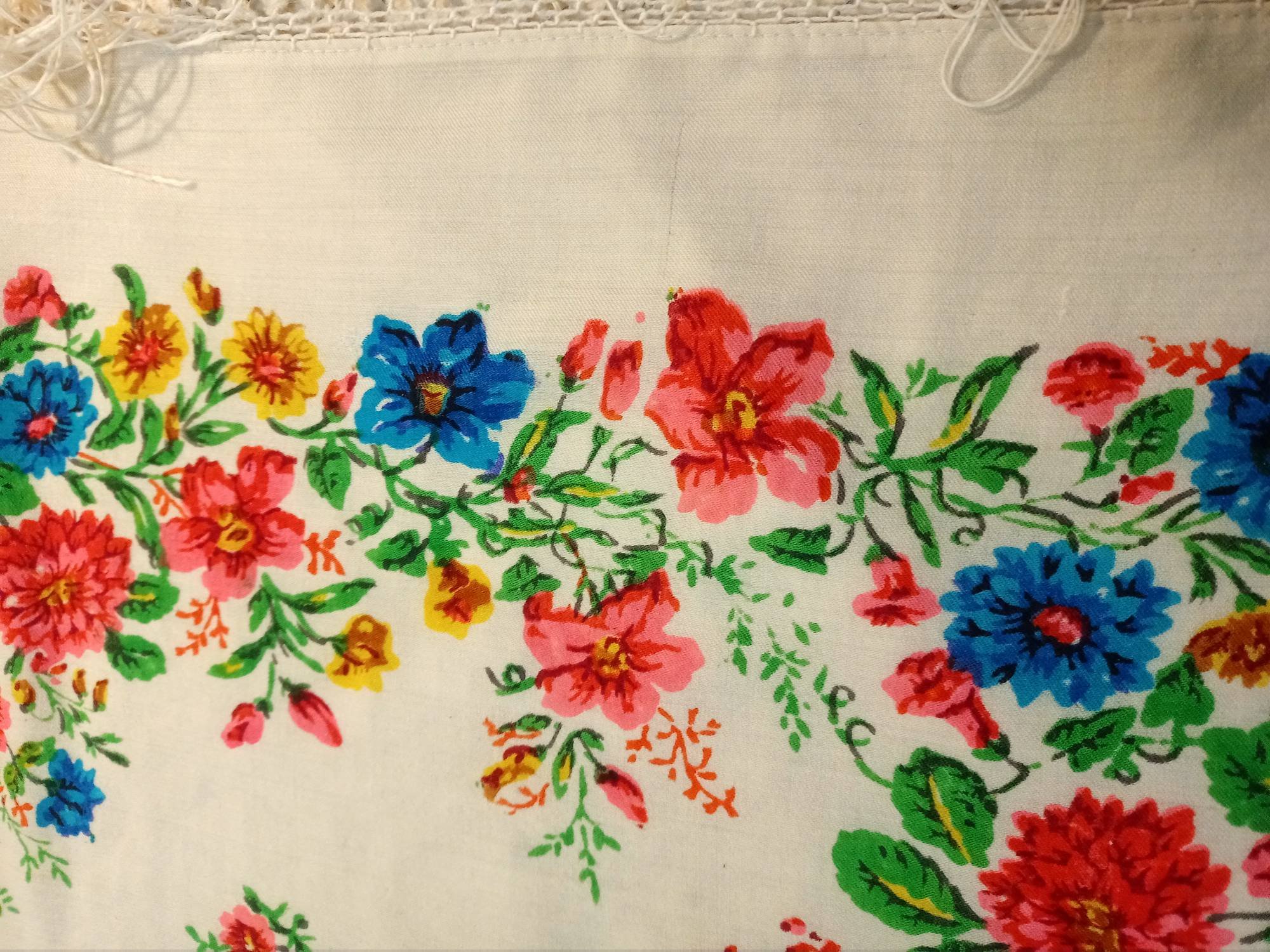 Купила на Мешке, по фото было непонятно, что за шаль, из какого материала. Решила, что довоенный хлопок. Ан нет. Шаль преподнесла сюрприз. Вот результаты тщательного осмотра: шаль ручной набойки на смесовой ткани (хлопок с вискозой), подгибка с закрытым срезом машинной строчкой по всему периметру. Бахрома вискозная, родная, в три клетки. Размер шали 150 см х141 см. На основании всего вышеперечисленного предполагаю датировку 1950-е гг., место производства - Павловский Посад.