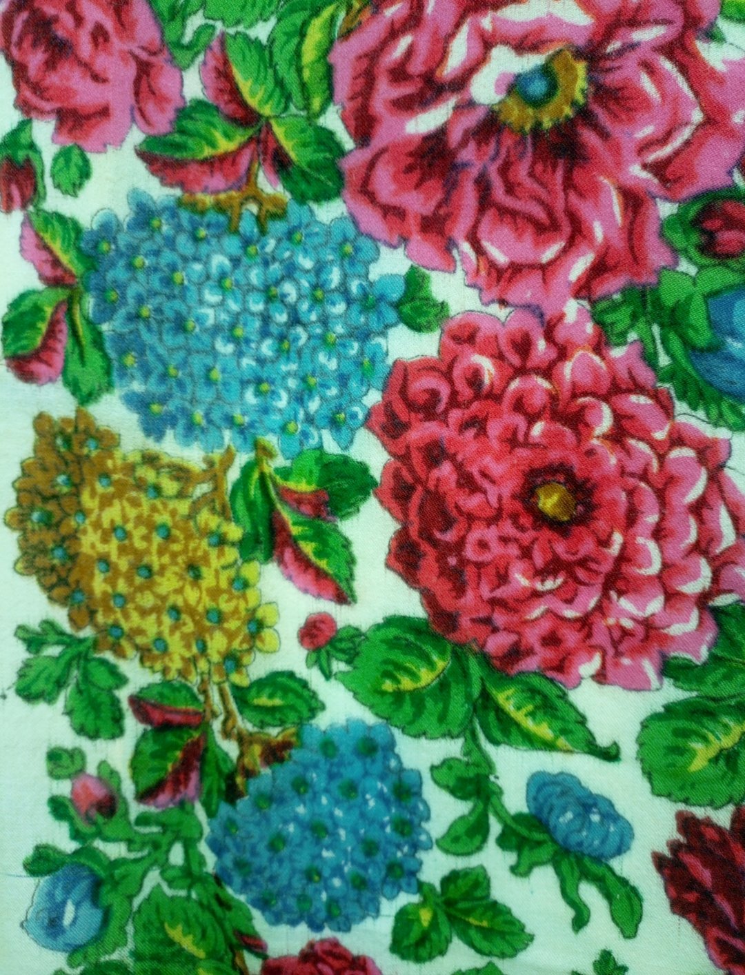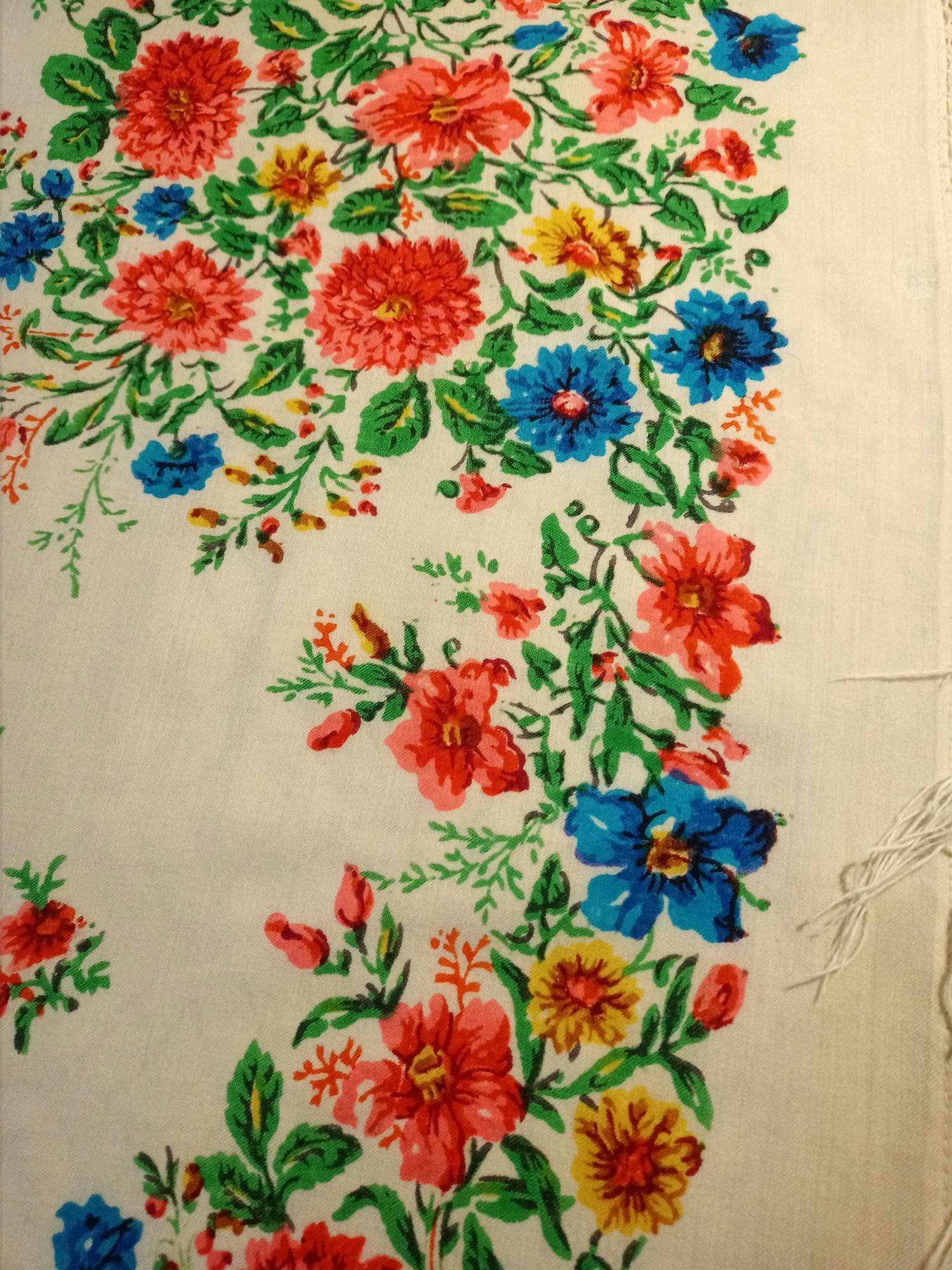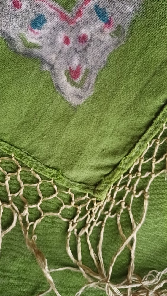 Купила на Мешке, по фото было непонятно, что за шаль, из какого материала. Решила, что довоенный хлопок. Ан нет. Шаль преподнесла сюрприз. Вот результаты тщательного осмотра: шаль ручной набойки на смесовой ткани (хлопок с вискозой), подгибка с закрытым срезом машинной строчкой по всему периметру. Бахрома вискозная, родная, в три клетки. Размер шали 150 см х141 см. На основании всего вышеперечисленного предполагаю датировку 1950-е гг., место производства - Павловский Посад.