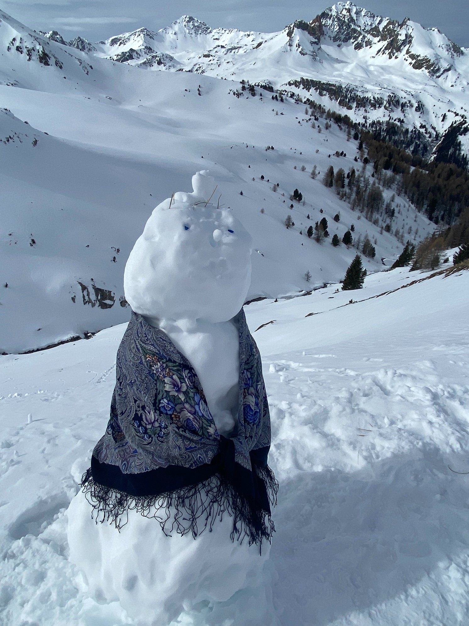 Традиционно платком укрывали коляску с мелким в послеобеденный сон. До обеда он, как и все, катался, успевая сделать несколько спусков между ног у мамы. Лыжки и ботиночки (самые маленькие) случайно тоже подошли к платочку, ну я и развлекалась от нечего делать в свое дежурство…