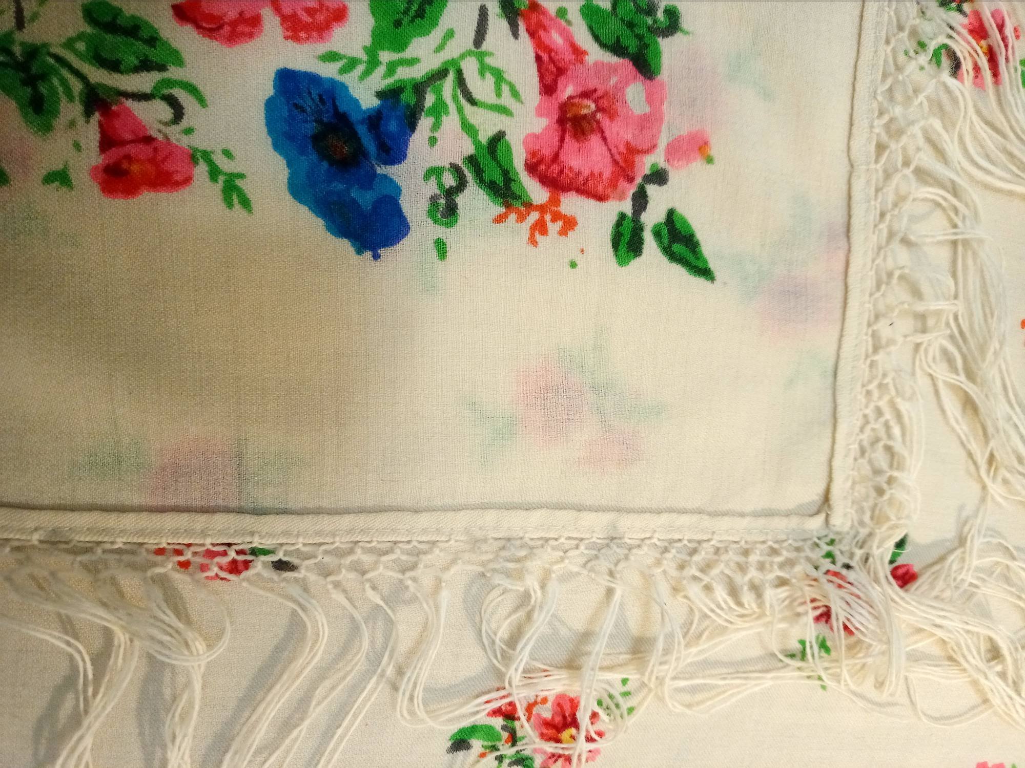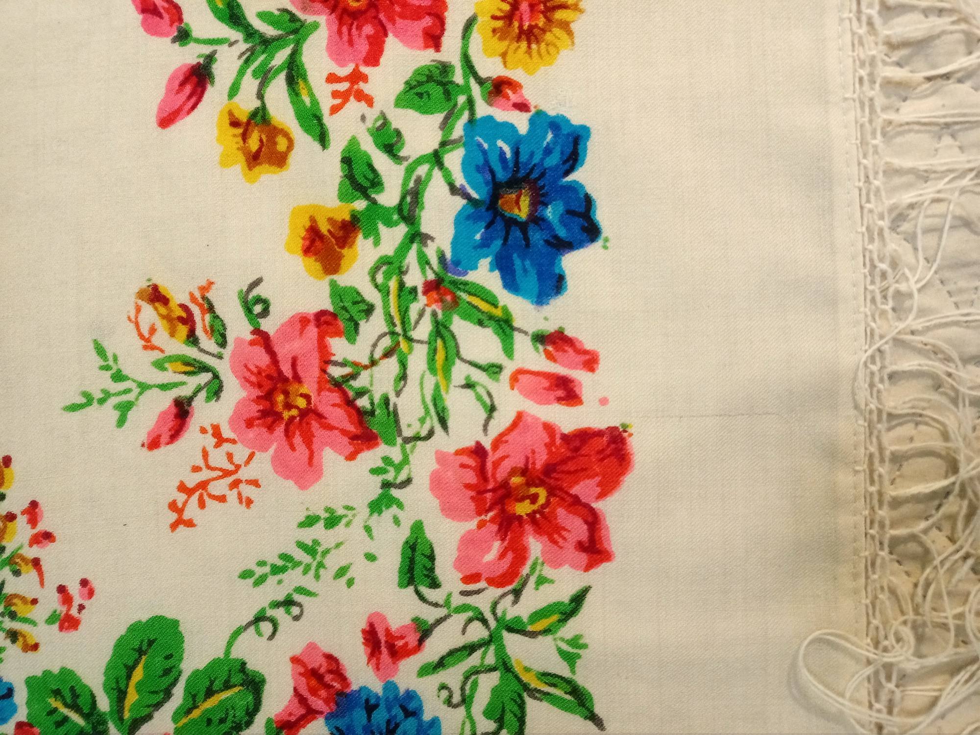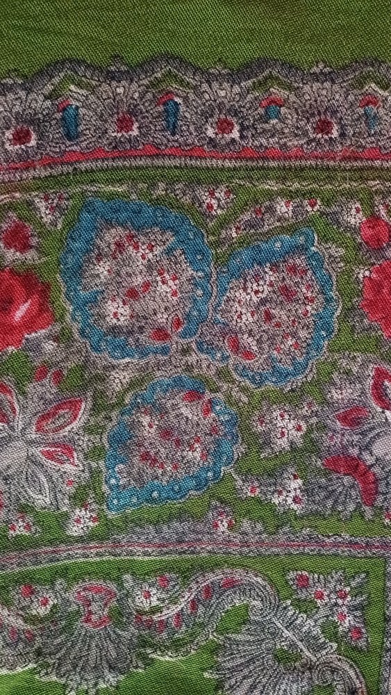 Купила на Мешке, по фото было непонятно, что за шаль, из какого материала. Решила, что довоенный хлопок. Ан нет. Шаль преподнесла сюрприз. Вот результаты тщательного осмотра: шаль ручной набойки на смесовой ткани (хлопок с вискозой), подгибка с закрытым срезом машинной строчкой по всему периметру. Бахрома вискозная, родная, в три клетки. Размер шали 150 см х141 см. На основании всего вышеперечисленного предполагаю датировку 1950-е гг., место производства - Павловский Посад.