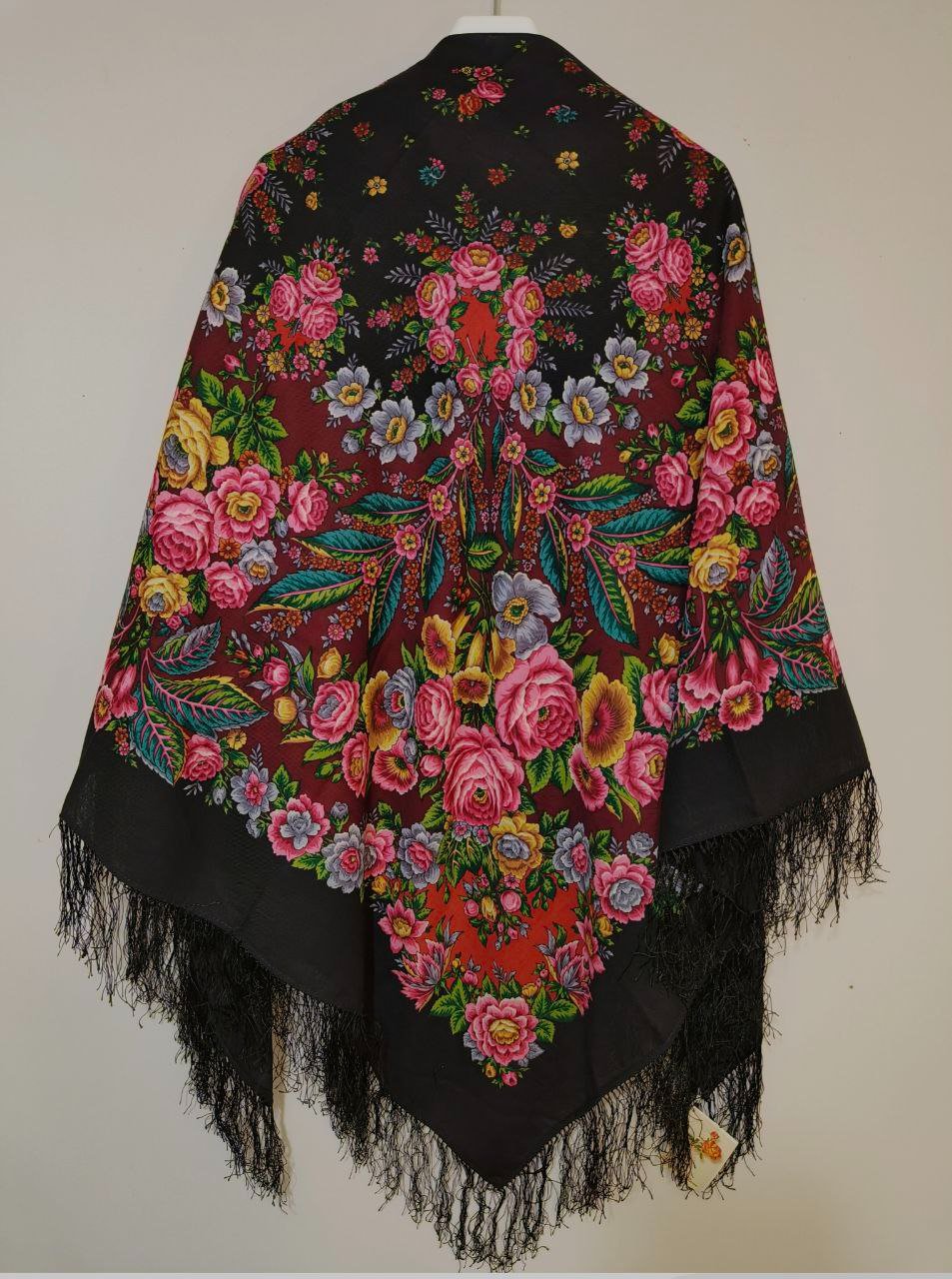 Когда этот платок появился на сайте, я была просто возмущена рисунком и особенно колоритом. Настолько он показался вычурным м дисгармоничным. Но увидев в магазине, просто остолбенела: потрясающий рисунок. Такие цветочки, такие листочки - нет слов. А колорит - сочетания оттенков красного, винного и розового, зеленого и бирюзы - просто фантастика!!