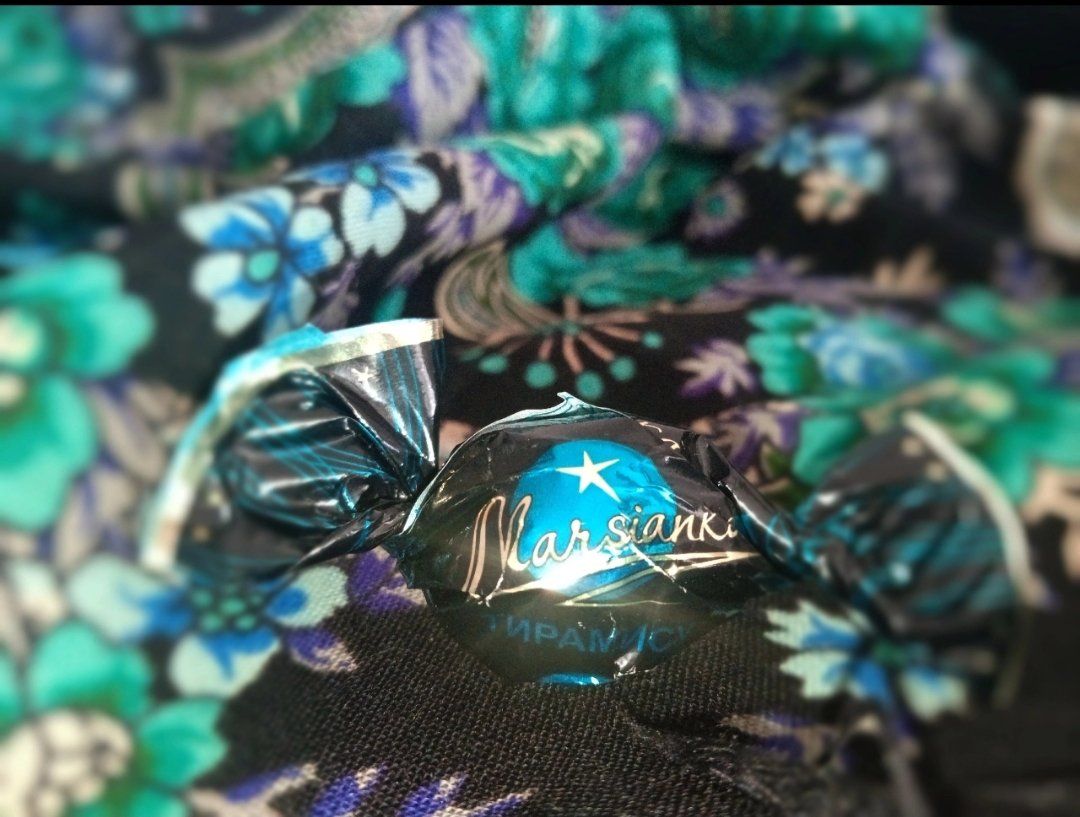 Но есть еще любимица, космическая "Русская красавица" старой печати на чёрном поле. Вот она, родимая, позировала мне с конфетами "Марсианка".