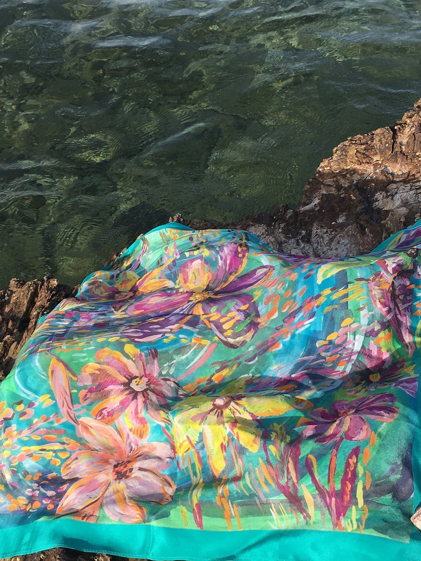 Нюанс – очень летний платочек во всех колоритах, а самый летний – 9-й. За несколько лет накопилось немало фото Нюанса из разных мест, и оказалось, что на всех есть вода.