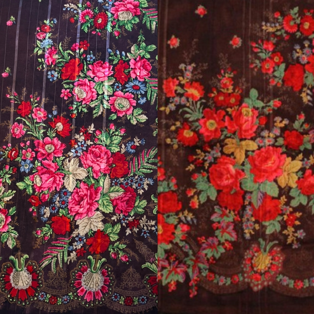 По фотографиям из книг того времени, о цветах судить действительно сложно, но по крайней мере, можно сравнить, все ли элементы рисунка присутствуют и находятся в одних и тех же местах. А ещё показалось любопытным вот что, я перелистала все имеющиеся книги о платках, и эта шаль ППД_219 фигурирует только в книге Галины Макаровской изданной ещё в СССР. У меня пока нет Каталога СПГИХМЗ Толстухиной и Полосиновой 2015 года, но у меня есть их книга Павловопосадские шали 2007 года, и этой шали там нет, что весьма странно. И в Госкаталоге её тоже пока нет.