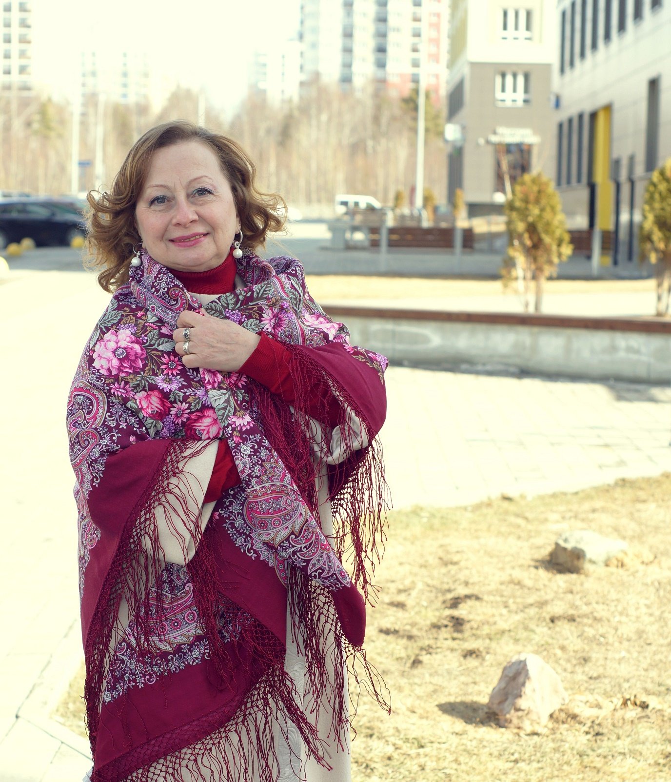 Очень идёт эта ярковишневая шаль Вам!! Оттенок потрясающий у каймы,оживляет,красит, фото радостные!