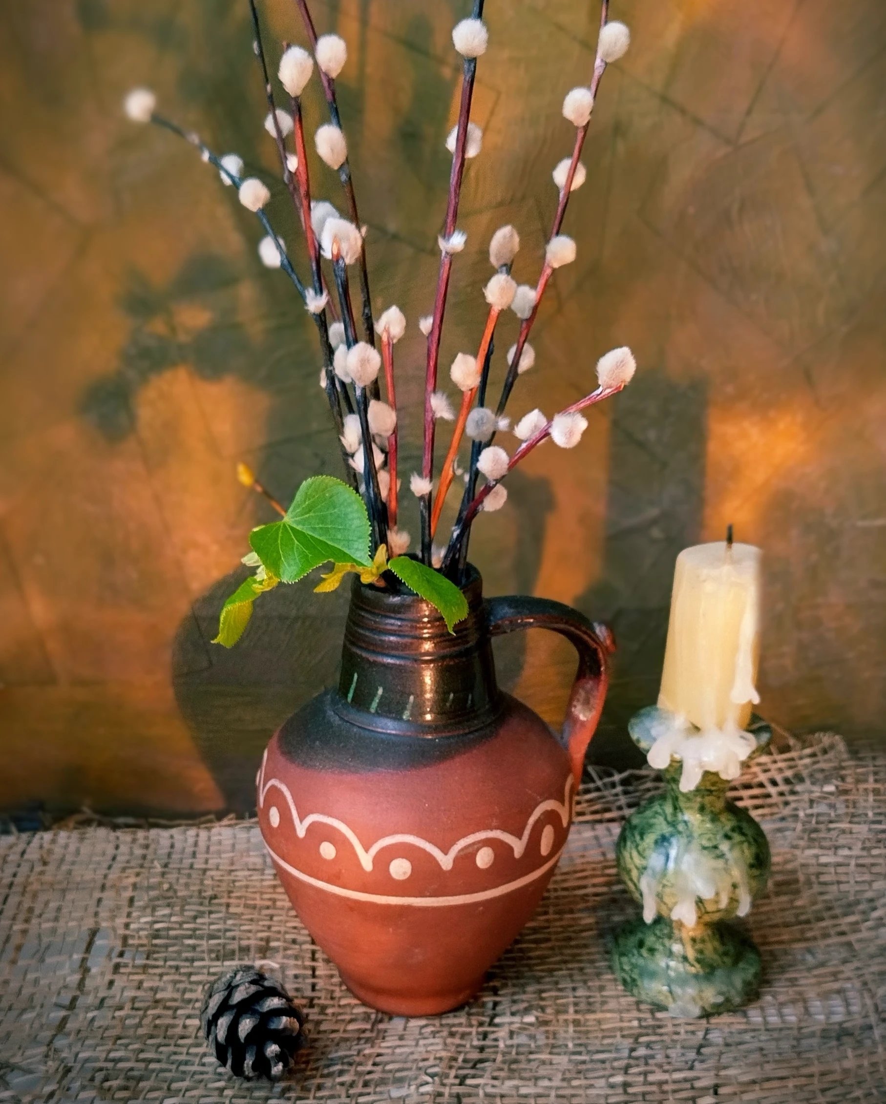 А жёлтая веточка на окне это форзиция, успела зацвести до возвращения зимы.