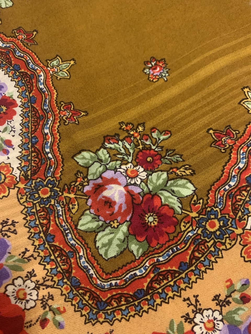 Танечка Ситникова, может меня ( забросают тапками) убедят, что именно этот платочек чешский, но не вижу я в нём ничего заморского. Ну, или уж сильно постарались, и им удалось. Но и ткань, и просновки, даже ритмичность и ширина просновочных полосочек, и размер ( ведь не больше и не меньше), и композиция рисунка. Так не бывает, чтоб подделка была так похожа на оригинал. Поэтому, думаю, наши они!