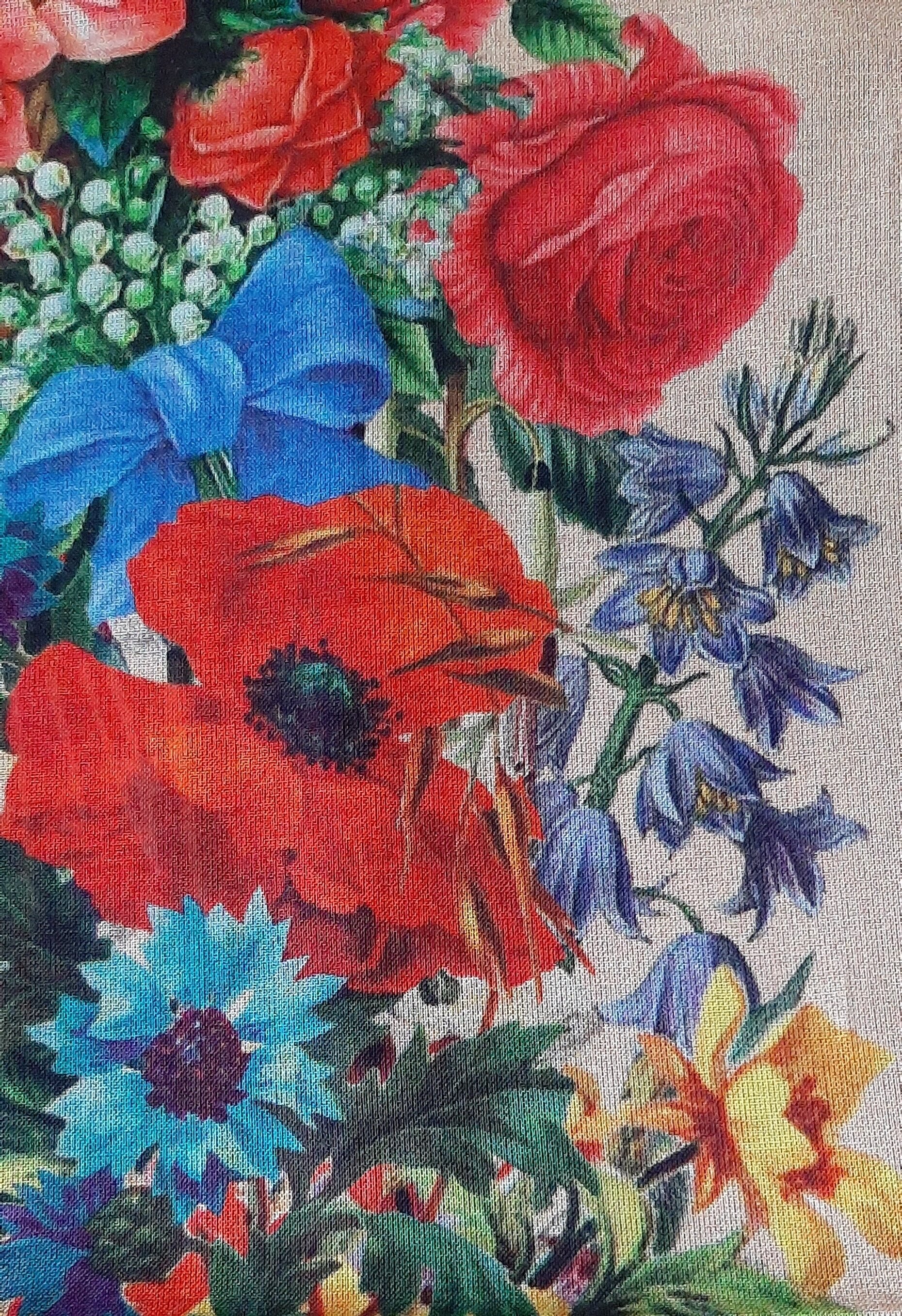 Розы, васильки, колокольчики, маки, анютины глазки, ландыши, незабудки и даже цветущая земляника. А кто еще какие цветы на этом платке опознал?