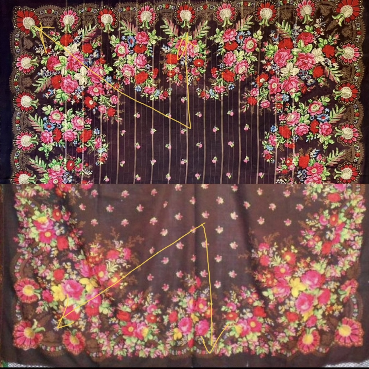 AcTpuD, благодарю за фото! Теперь всё очевидно. Это прямо беда какая-то с этими фотографии. Да именно такие отличия хорошо видны. Очевидно, надо найти ещё одну шаль и сравнить их рядом. Очень хочется понять второго производителя, но мне кажется, что это Лабзин.