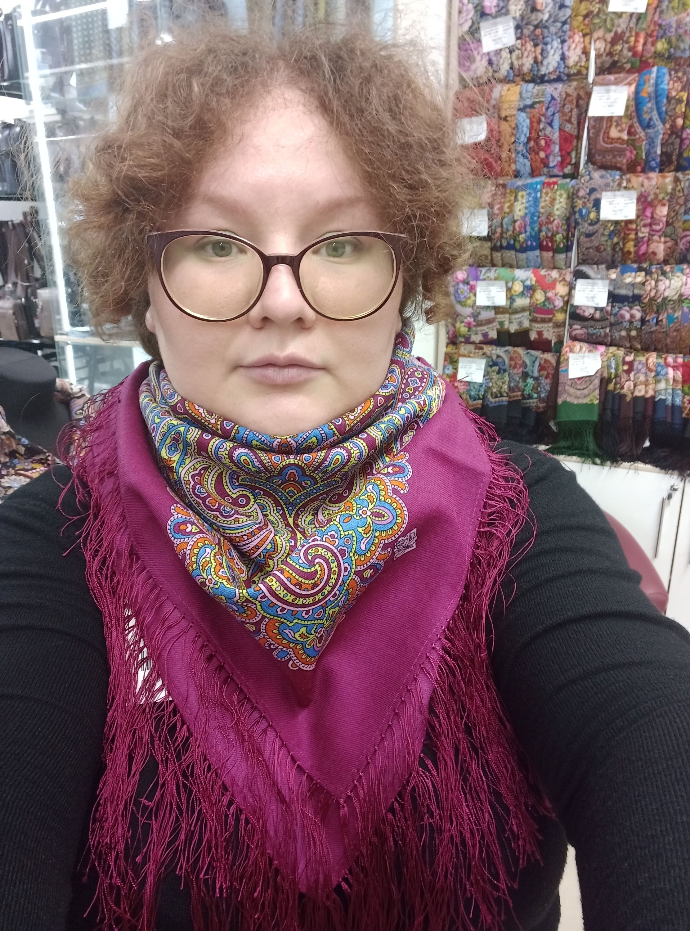 Одним прекрасным днем, гуляя возле Петропавловской крепости, я увидела магазинчик павловопосадских платков и по какому-то наитию зашла в него. Надо сказать, что в моем тогдашнем представлении, и по единственному опыту от подаренного мамой в конце 1990-х годов большого синего платка с крупными кричащими красными розами, платки ППМ ассоциировались для меня с чем-то старомодным, деревенским и на колючей толстой шерсти. Но увидев в питерском магазине изобилие красок и рисунков, пощупав ткани, я подумала, что из такого количества что-то наверняка можно будет выбрать. Я тут же позвонила своей знакомой, показала по видео магазинное изобилие, и она с радостью согласилась на павловские платки. Продавец стала демонстрировать на себе разные платки и шали (и делала это с удовольствием), я же транслировала это шоу по видео своей знакомой за тридевять замель. В результате все деньги моей приятельницы остались в магазине, а у нее появилось четыре больших шерстяных платка и два или три шелковых.
